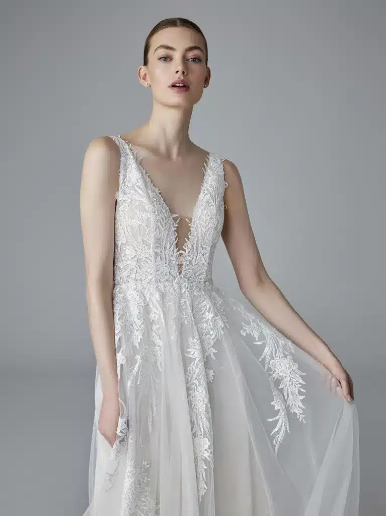 Das komplett aus Tüll gefertigte Modell zeichnet sich durch eine schmeichelhafte Silhouette mit tiefem V-Ausschnitt auf der Vorderseite und dem Rücken aus und ist sowohl am Mieder als auch am schmeichelhaften mehrlagigen Rock mit Spitze verziert.