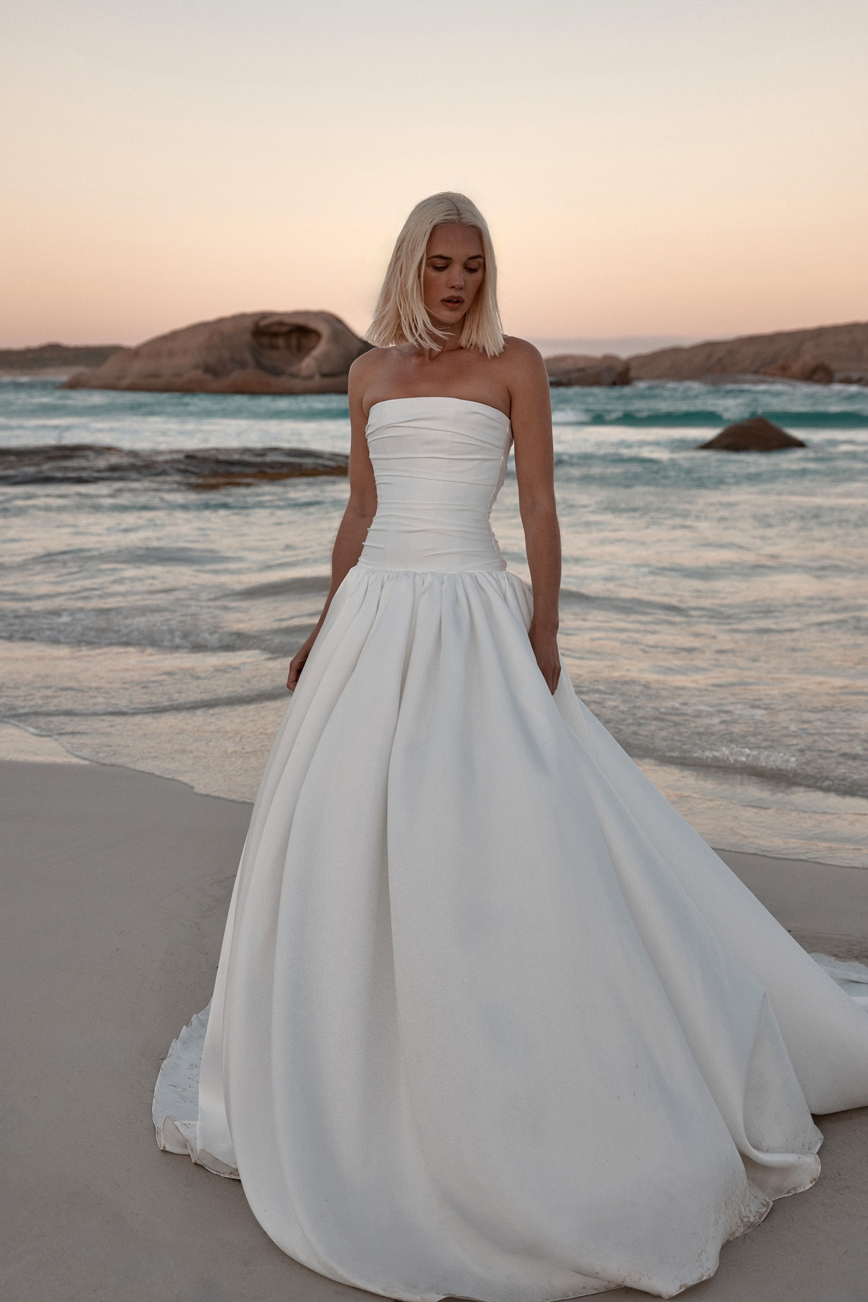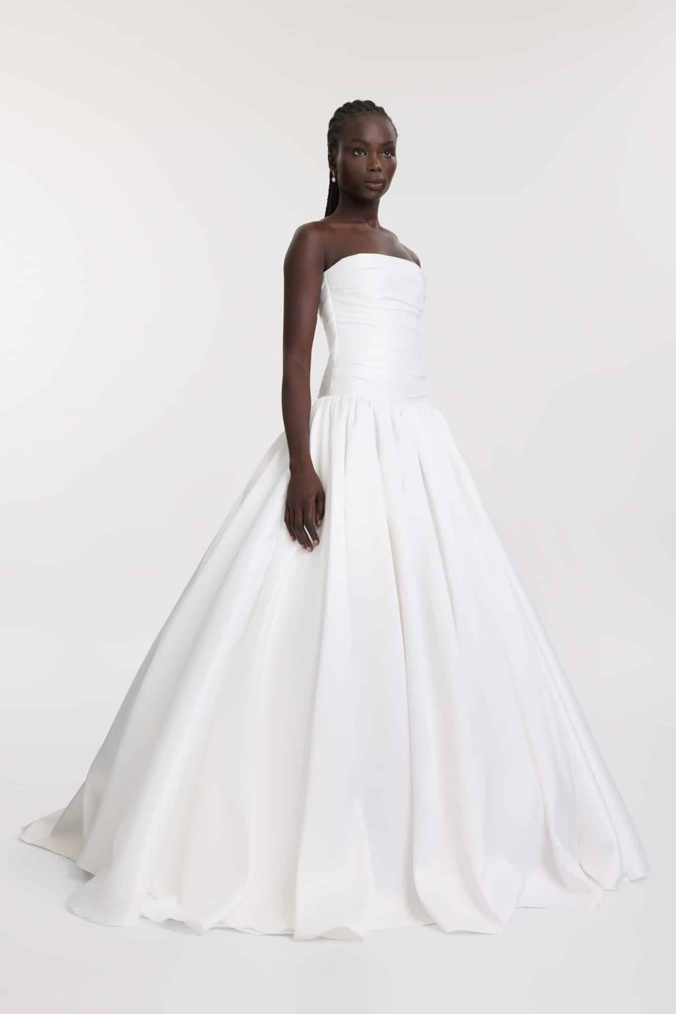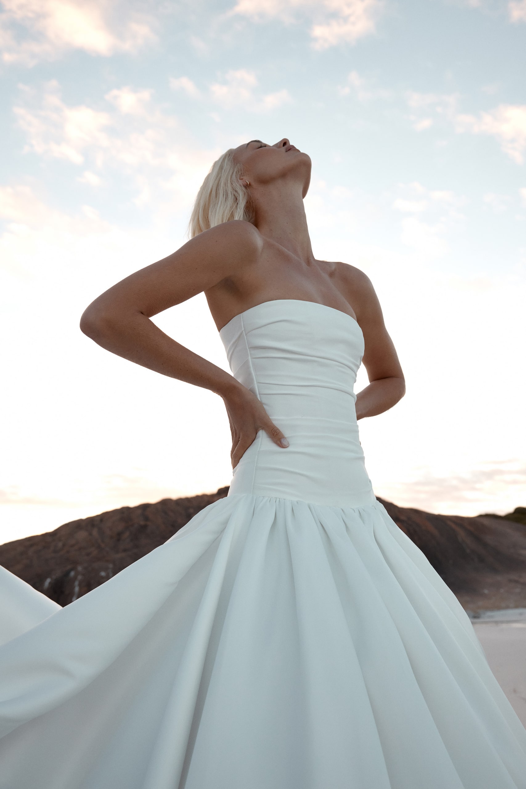 Drehe das Volumen auf – und ziehe die Blicke auf dich – in Lucky. Moderne Couture trifft auf Details aus den Achtzigern – dank des strukturierten, drapierten Miederteils und des gerafften, vollen Rocks. Gefertigt aus luxuriösem Duchess, ist Lucky ein eleganter Blickfang.
