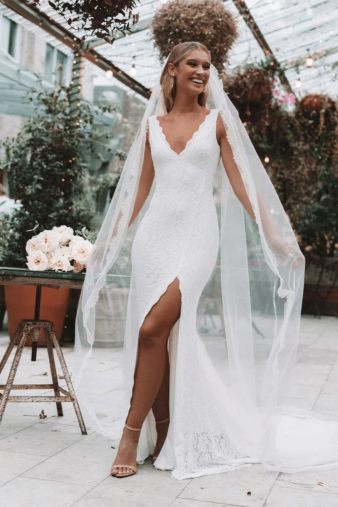 Das bisher innovativste und umweltfreundlichste Kleid: Lumi verkörpert den Ethos der Marke. Es wird aus international zertifizierten Materialien hergestellt und ist nachhaltig und ethisch vertretbar produziert. Der sinnliche Charme von Lumi wird durch einen tiefen Ausschnitt und einen hohen Schlitz verkörpert. Dieses Hochzeitskleid aus Spitze verströmt eine tief romantische Anziehungskraft.