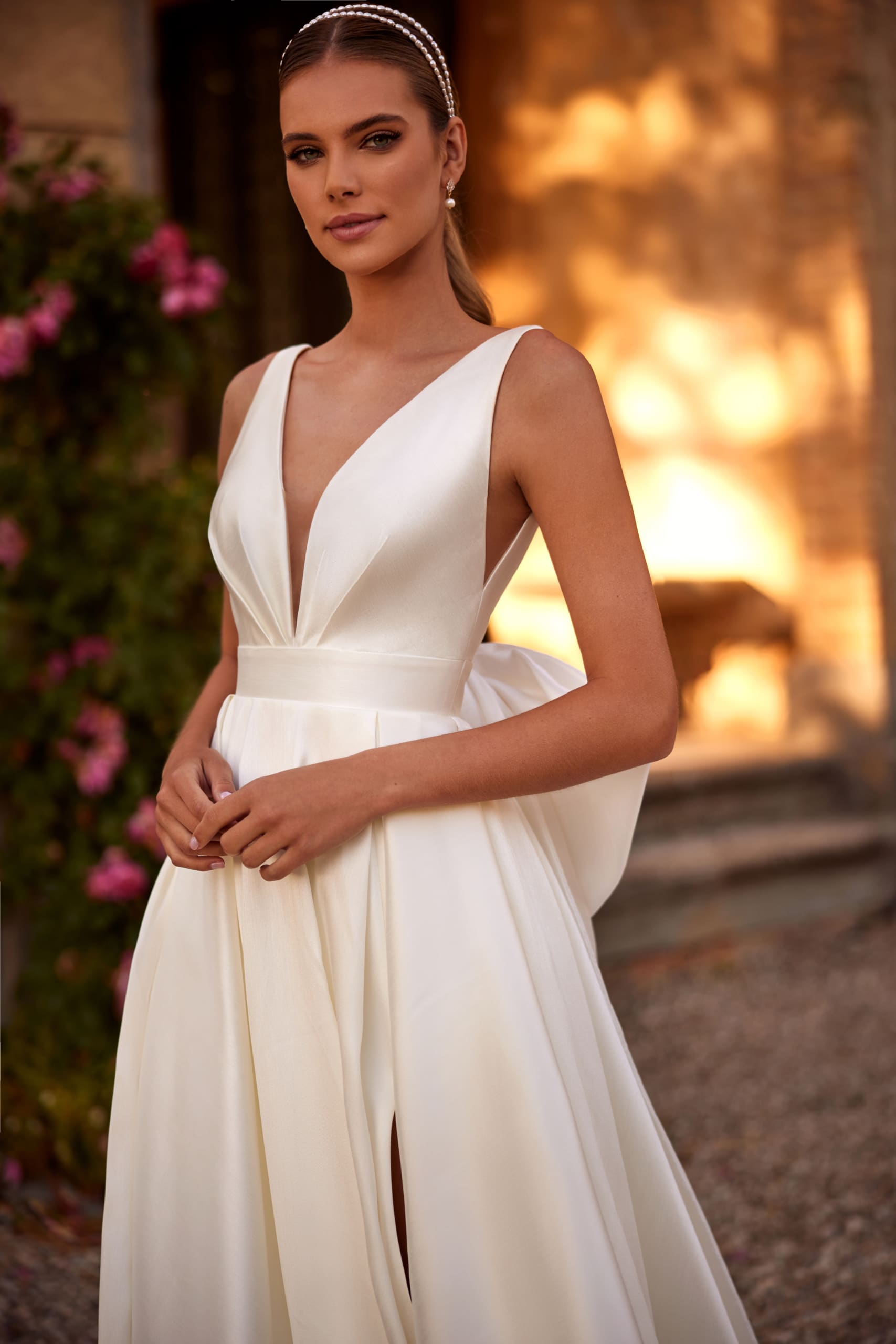 Margo ist ein klassisches Kleid aus fließendem Satin, mit klaren Linien drapiert, die der Figur schmeicheln und von Anmut und zeitloser Schönheit erzählen. Ein tiefer V-Ausschnitt nimmt die Form des seitlichen Schlitzes des langen Rocks auf und sorgt dafür, dass du uneingeschränkt tanzen kannst.
