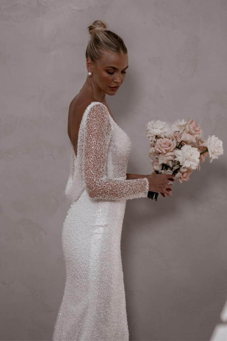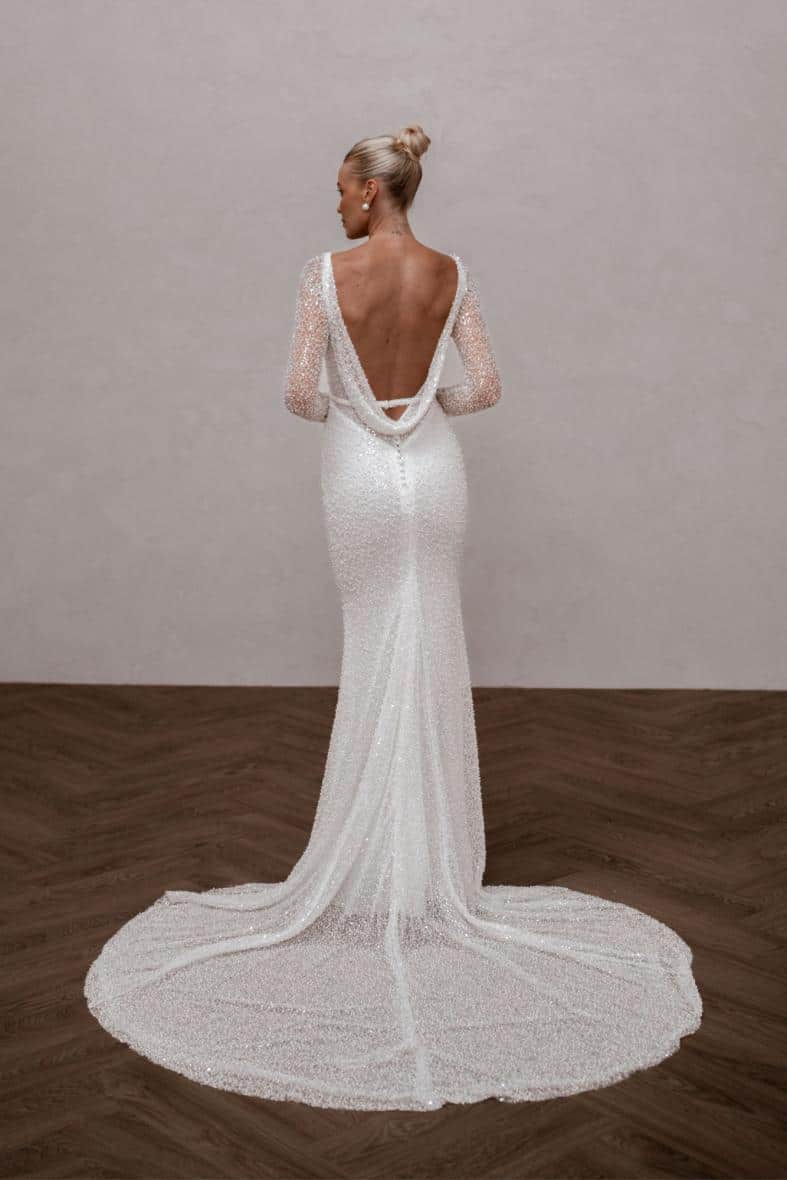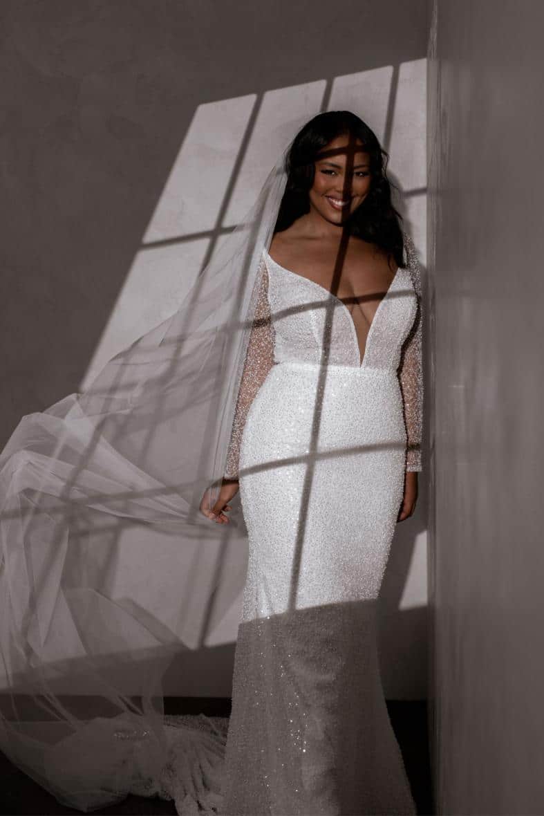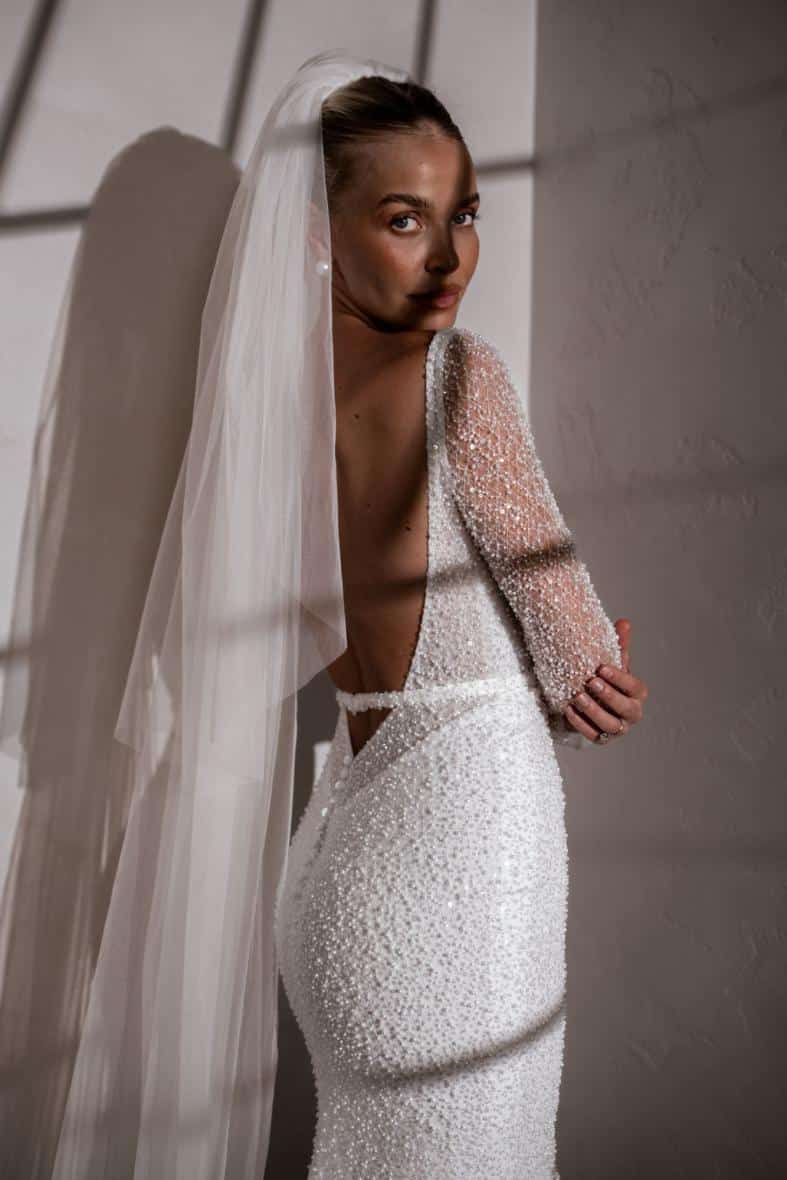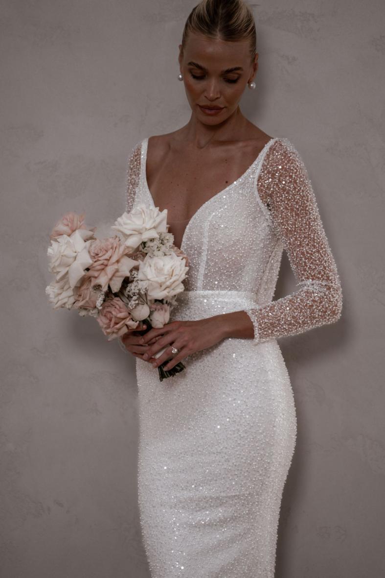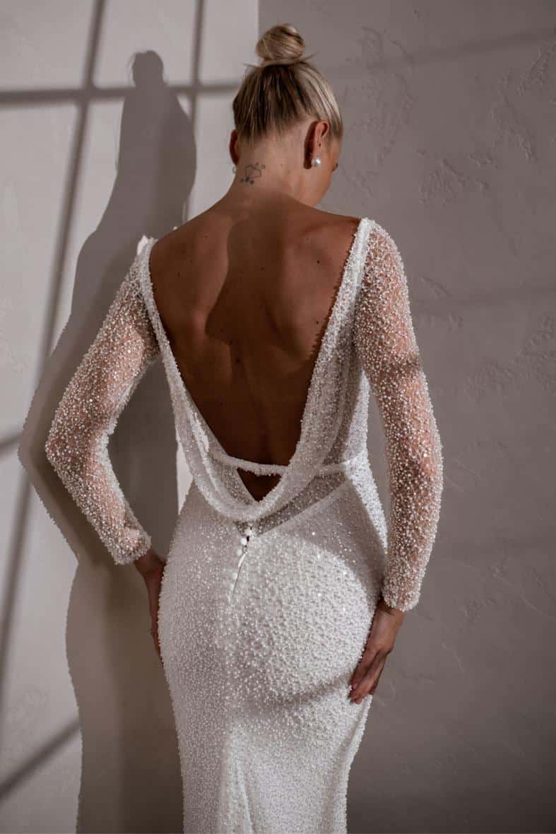 Margot ist eine Ikone, die mit den perlenbesetzten, langen, transparenten Ärmeln und der perfekt drapierten, abnehmbaren Kapuze puren Luxus ausstrahlt. Außerdem verfügt sie über einen atemberaubenden, abnehmbaren Gürtel, der die Modernität des Designs noch unterstreicht und in Kombination mit dem tief ausgeschnittenen Rücken die perfekte Illusion eines Ausschnitts erzeugt. Margot ist die Verkörperung von Eleganz, Klasse und Opulenz.