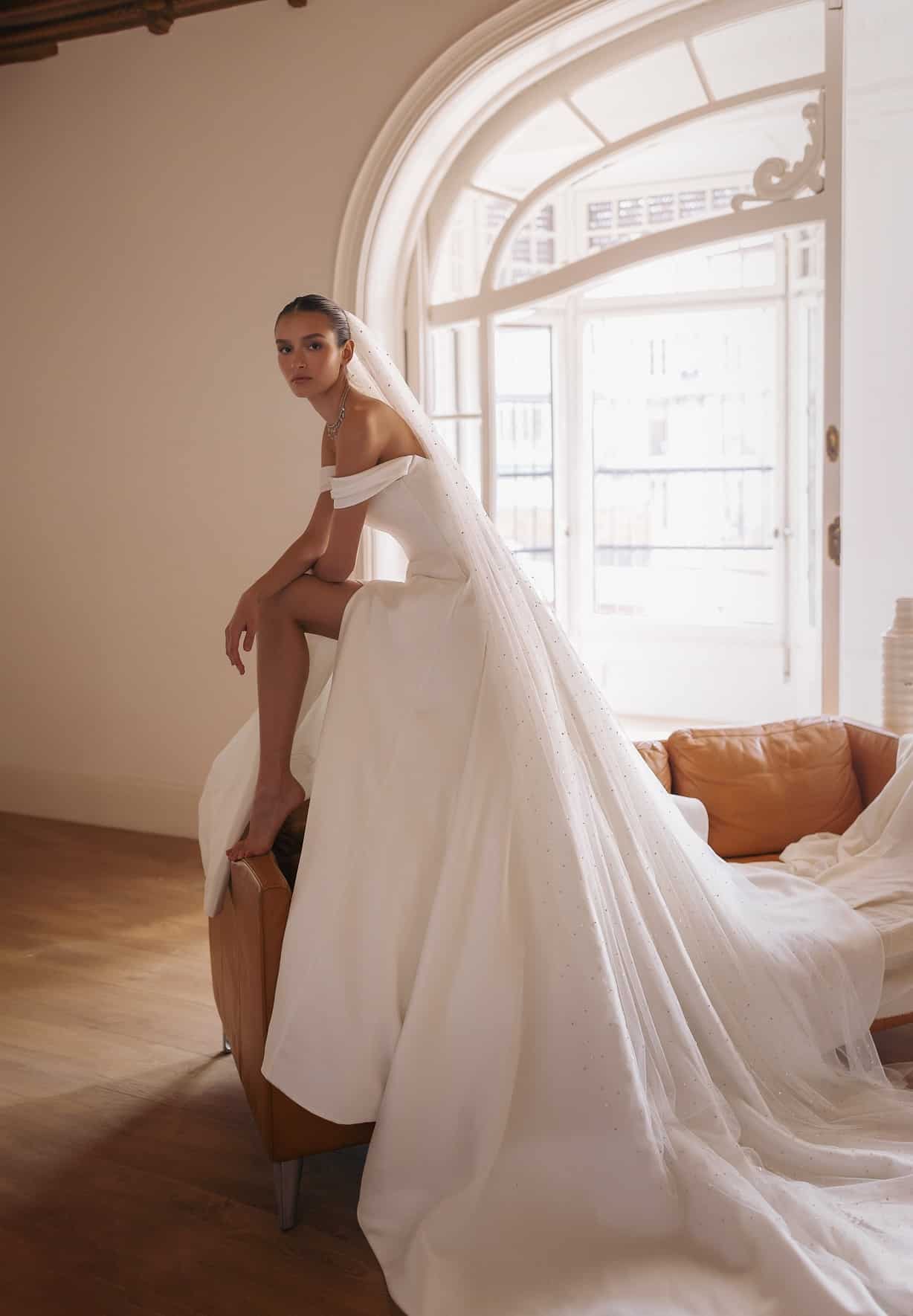 Marlowe – Kleid mit geradem Ausschnitt und Off-Shoulder Träger, mit voluminösem, glatt geschlitztem Rockteil.