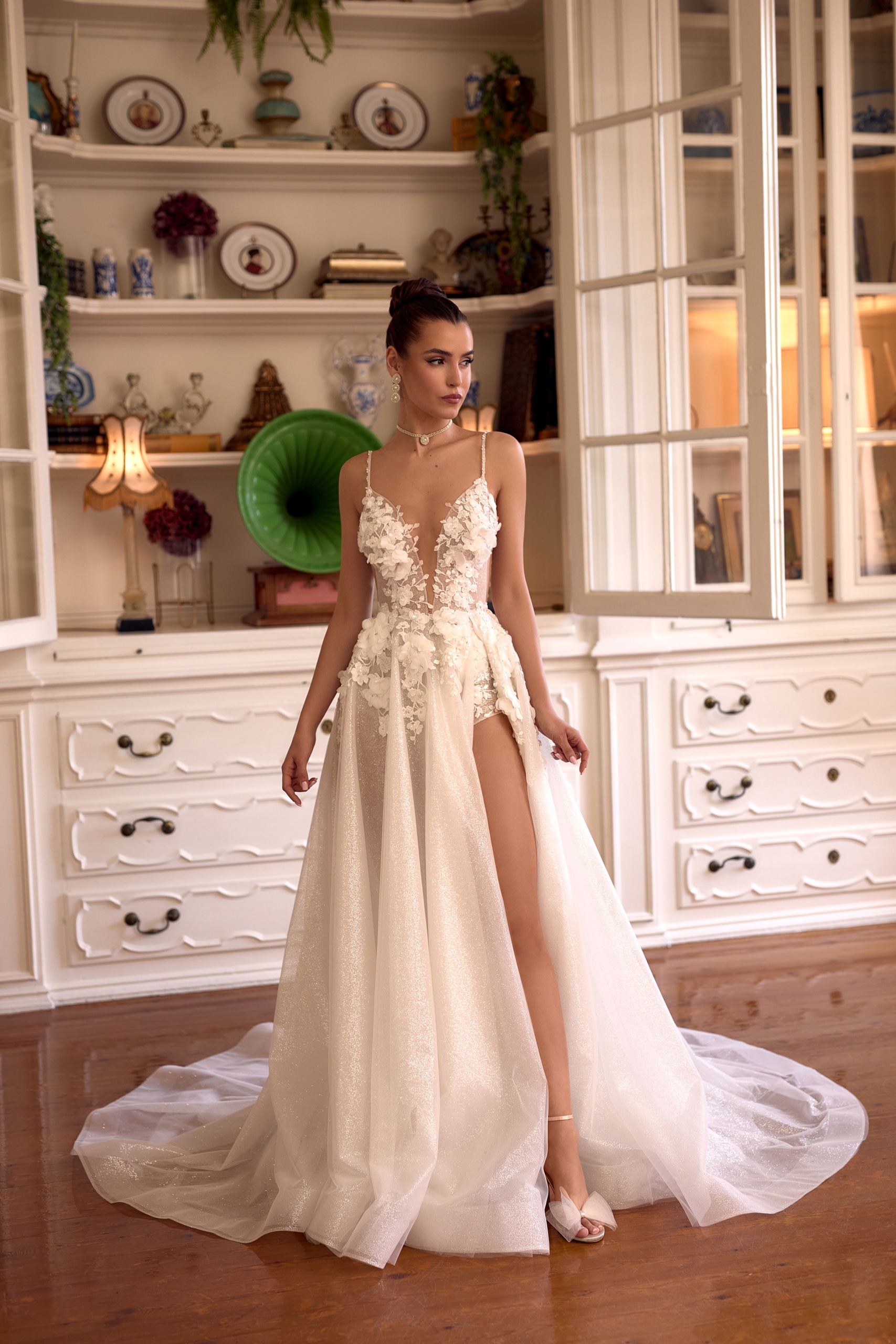 Dieses Brautkleid vereint moderne Eleganz mit einem Hauch von Glamour. Die 3-D Spitze verleiht dem Kleid eine raffinierte Textur, während der hohe Schlitz im Tüllrock deine Silhouette perfekt zur Geltung bringt. Der tiefe V-Ausschnitt mit zarten Cut-Outs an den Seiten sorgt für einen verführerischen Look, der durch den funkelnden Glitzertüll komplettiert wird. Ein Kleid für die Braut, die mit Stil und Selbstbewusstsein ihren großen Tag feiern möchte.