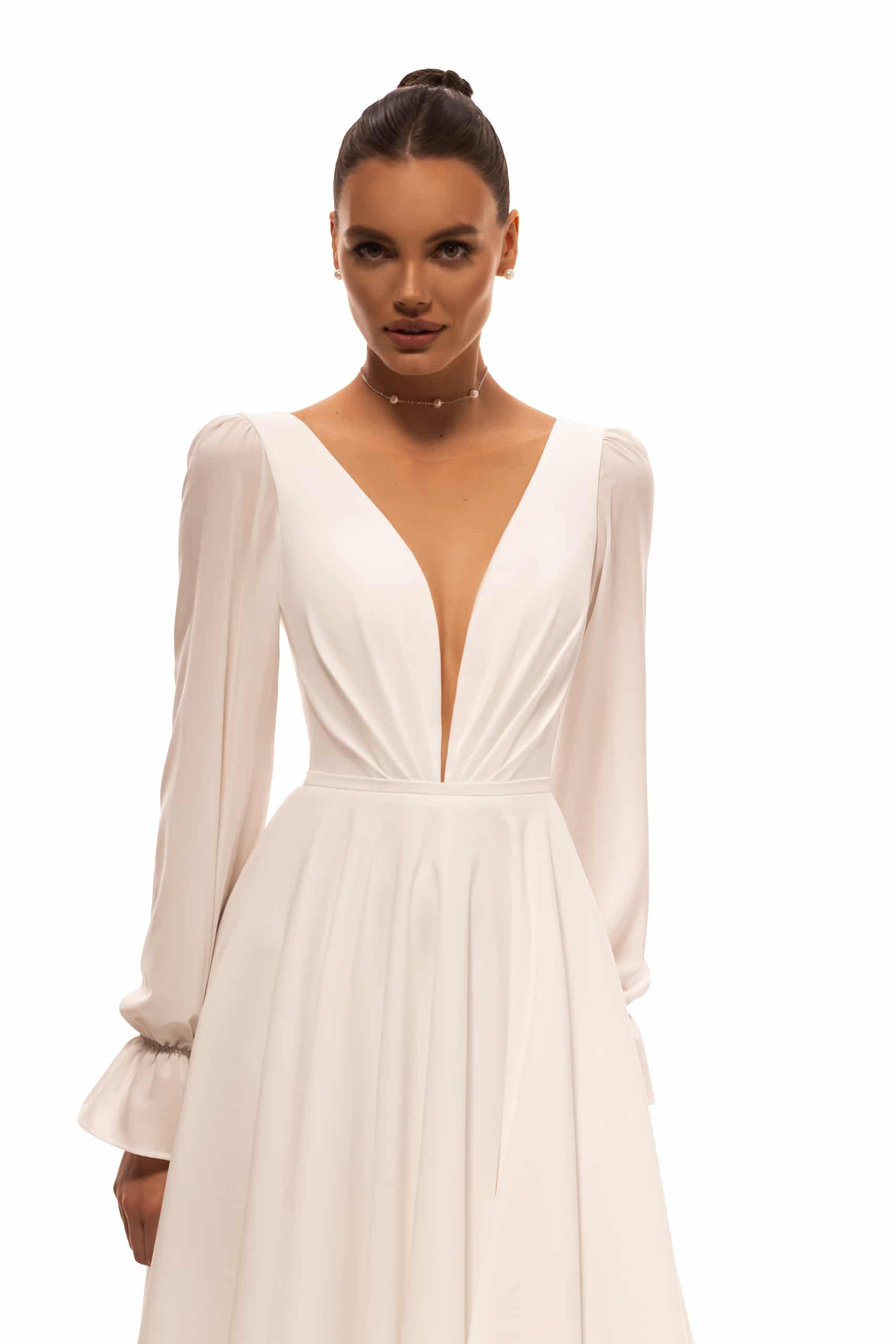 Das Millie Kleid in A-Linie ist aus leichtem Chiffon gefertigt. Der tiefe Ausschnitt ist mit transparentem Netz überzogen. Auf der Rückseite sorgen ein V-förmiger Schnitt und ein Reißverschluss für Bequemlichkeit. Drapierungen am Korsett betonen die Taille und machen sie optisch schmaler. Lange Ärmel und eine Schleppe verleihen dem Bild noch mehr Leichtigkeit.
