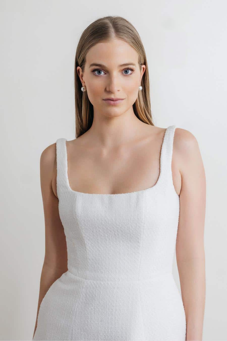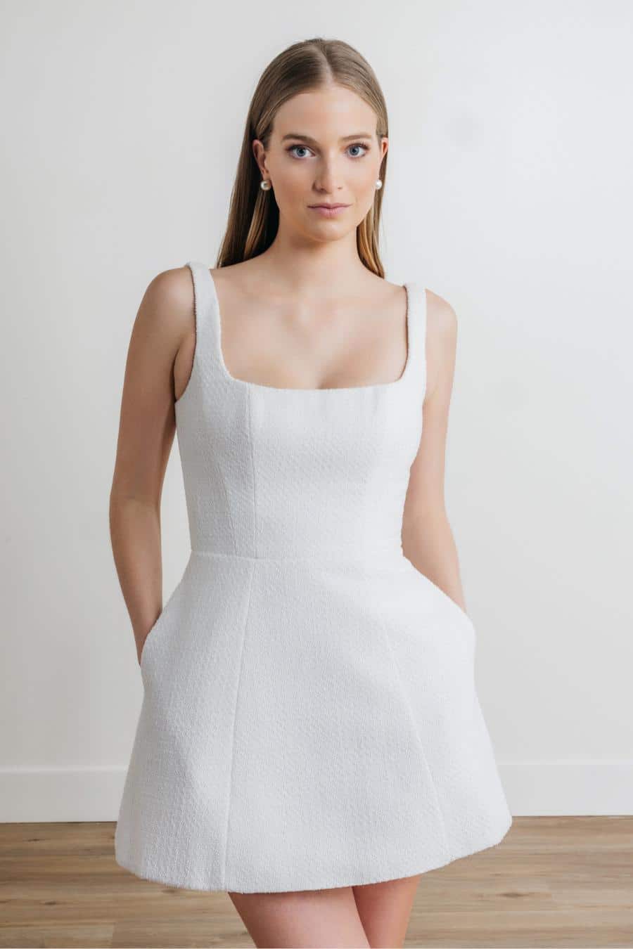Misia ist ein modernes Modell aus schimmerndem Boucle mit einer zeitlosen Mini-Silhouette in A-Linie, das einen klassischen Stil aufgreift. Passform-Hinweis: Achte bei der Wahl der Größe auf die Maße von Taille und Oberweite, da der Rock viel Platz bietet!