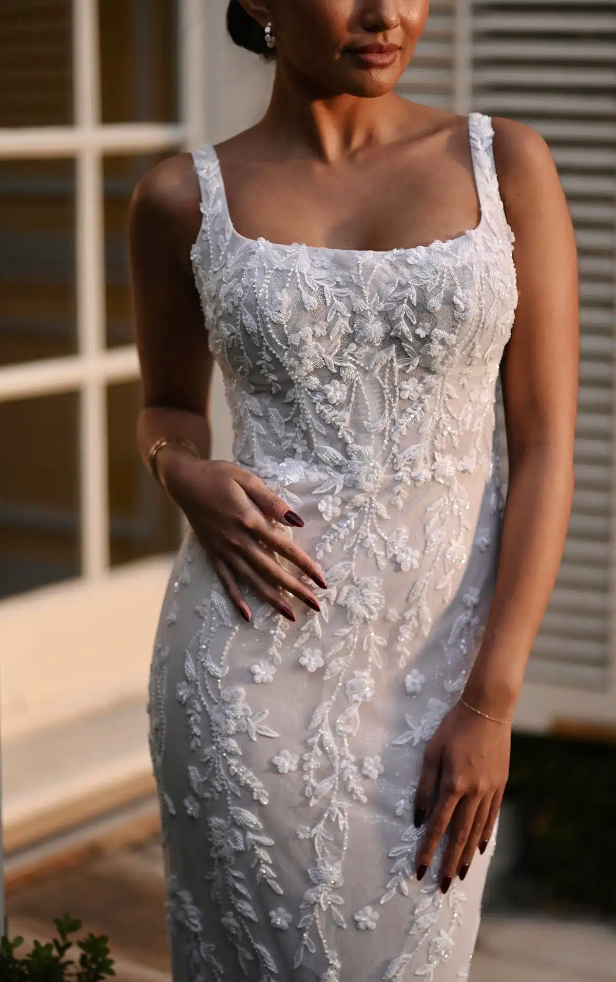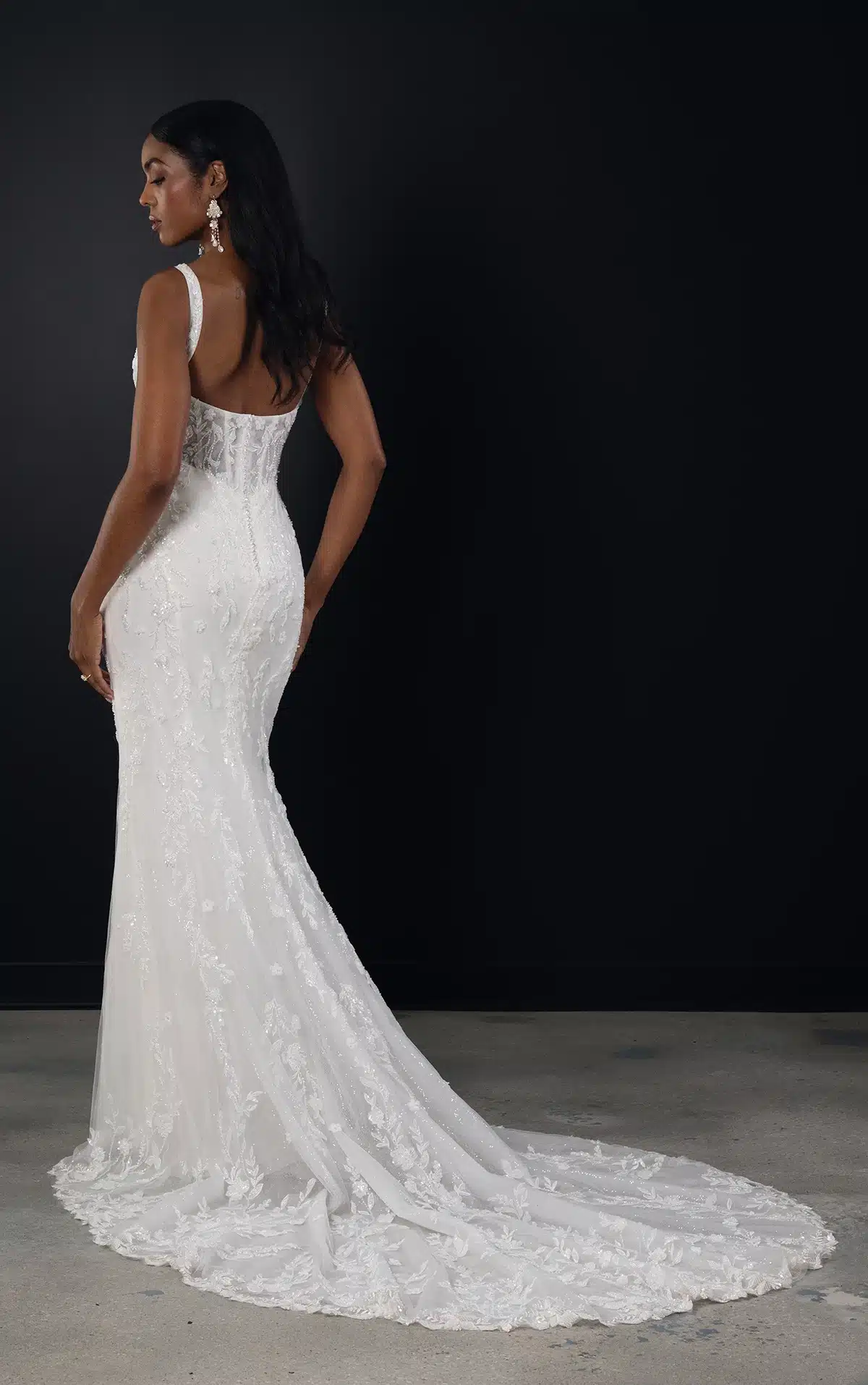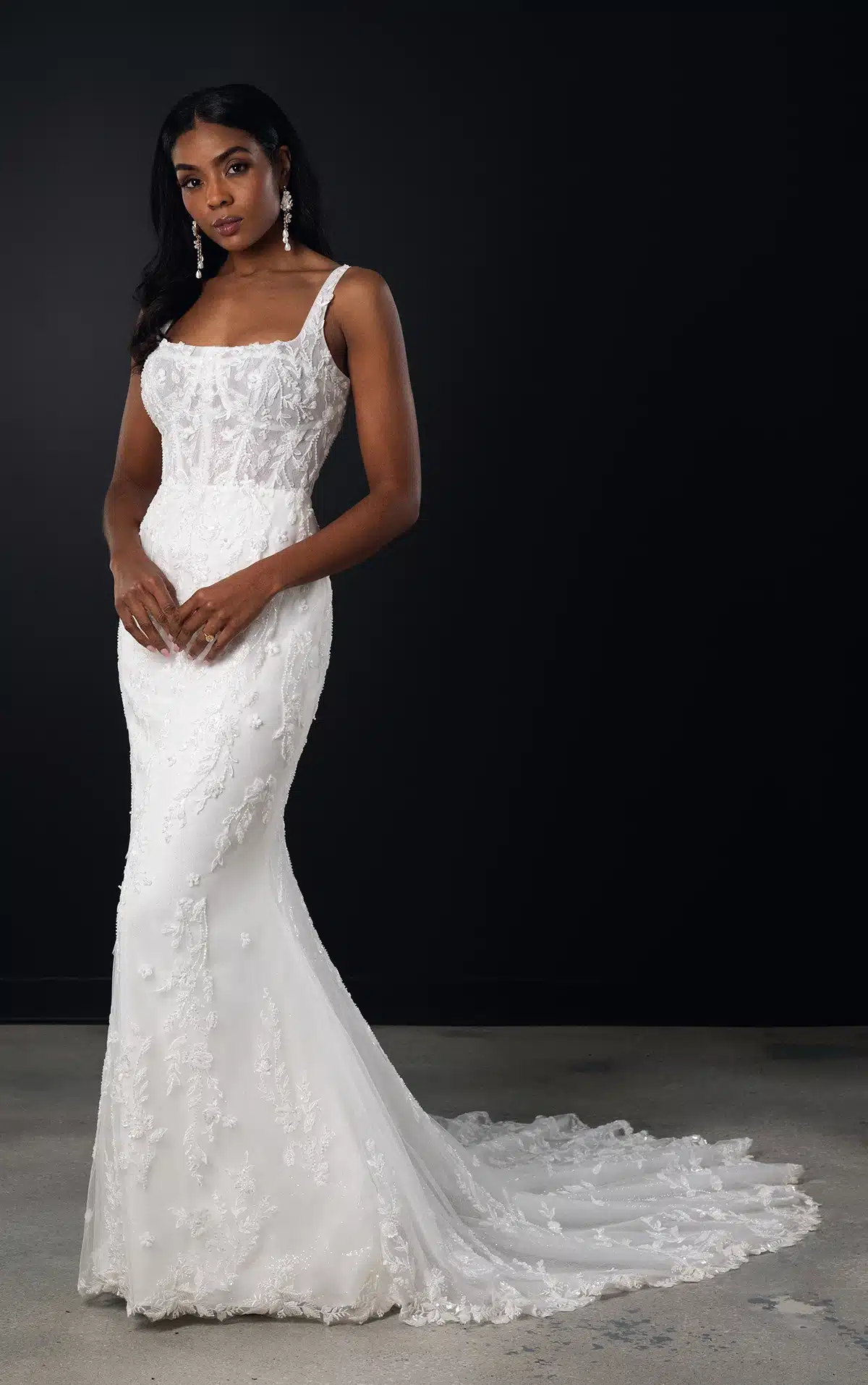 Style 1821 ist ein romantisches Hochzeitskleid mit quadratischem Ausschnitt, das für die moderne Braut gemacht ist und mit schillernder Blumenspitze verziert ist. Schicke Träger zieren die Schulter und treffen auf den eleganten quadratischen Ausschnitt eines halbdurchsichtigen Bustier-Korsetts. Florale Spitze ist mit exquisiten Perlen- und Paillettenakzenten verziert, die über das gesamte Brautkleid aus Spitze und Glitzertüll verstreut sind und im Rücken auf eine Reihe von Kristallknöpfen treffen. Der romantische Säulenrock fällt mühelos in eine ausladende, mit Spitze besetzte Schleppe, die diesem modernen Designer-Brautkleid den letzten Schliff verleiht.