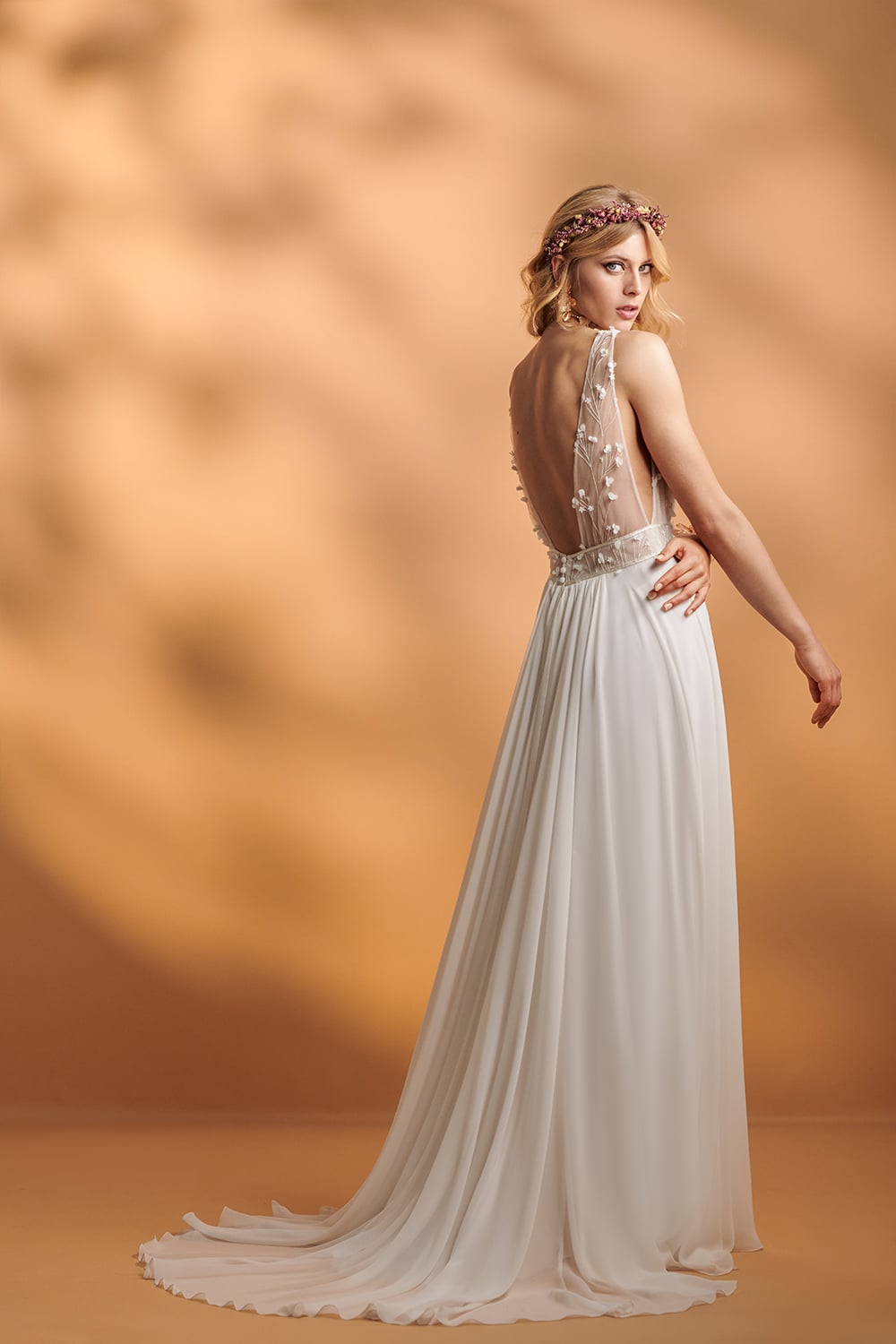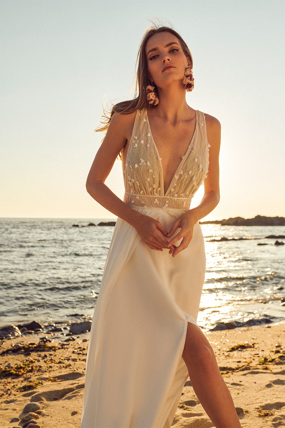 Dieses Kleid steckt voller Details. Das Oberteil ist ärmellos und aus besticktem Tüll mit beigem Futter. Es hat vorne und hinten einen tiefen V-Ausschnitt. Der Rock besteht aus fließendem Chiffon mit einem Schlitz in der Mitte und einer Schleppe.