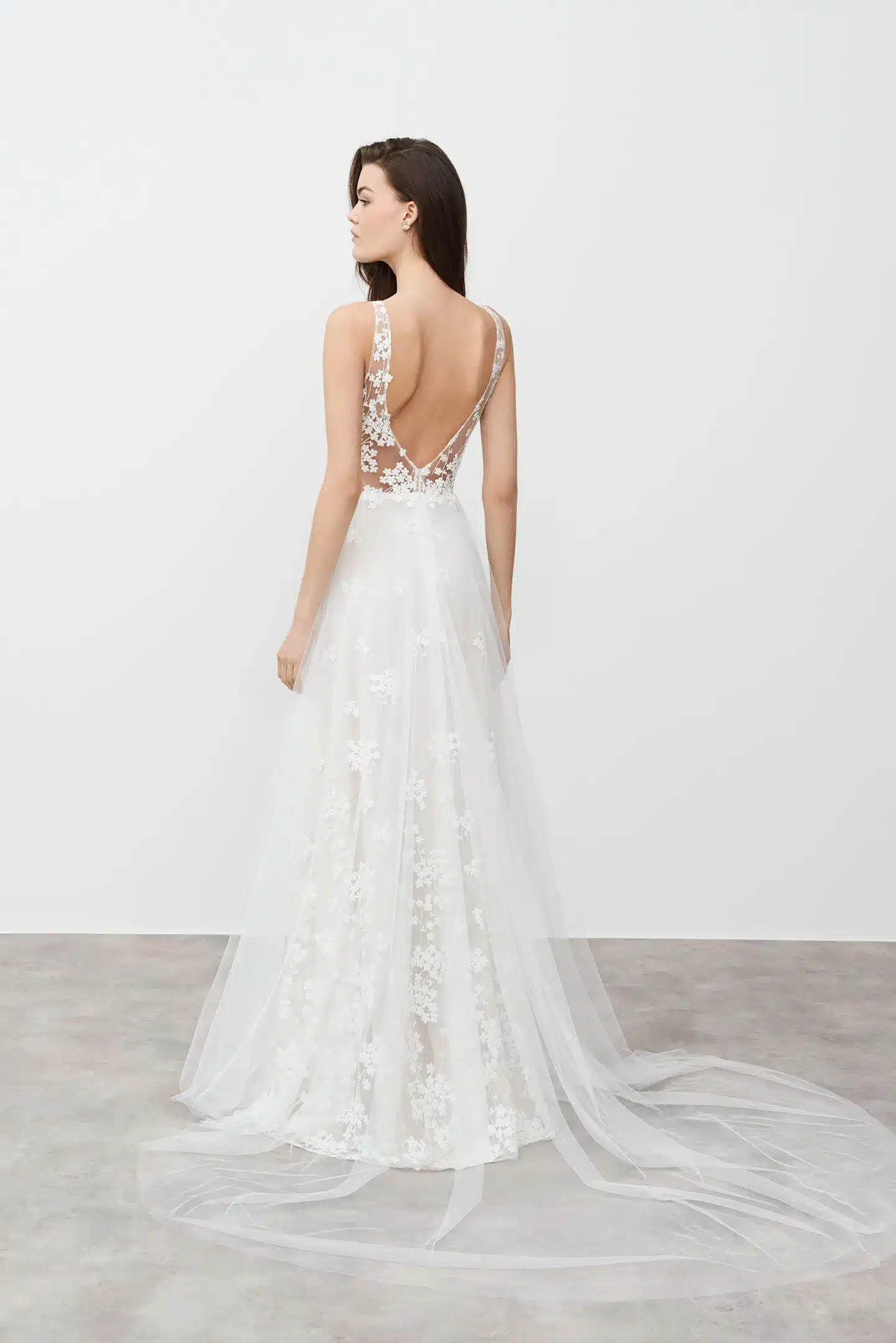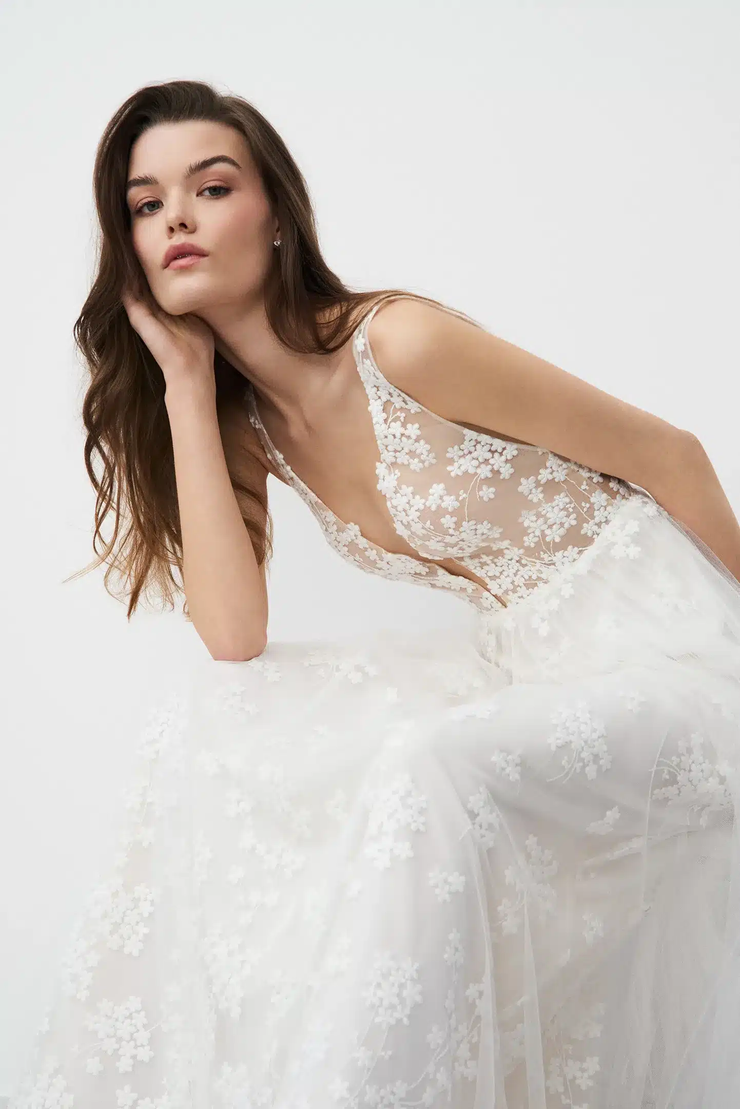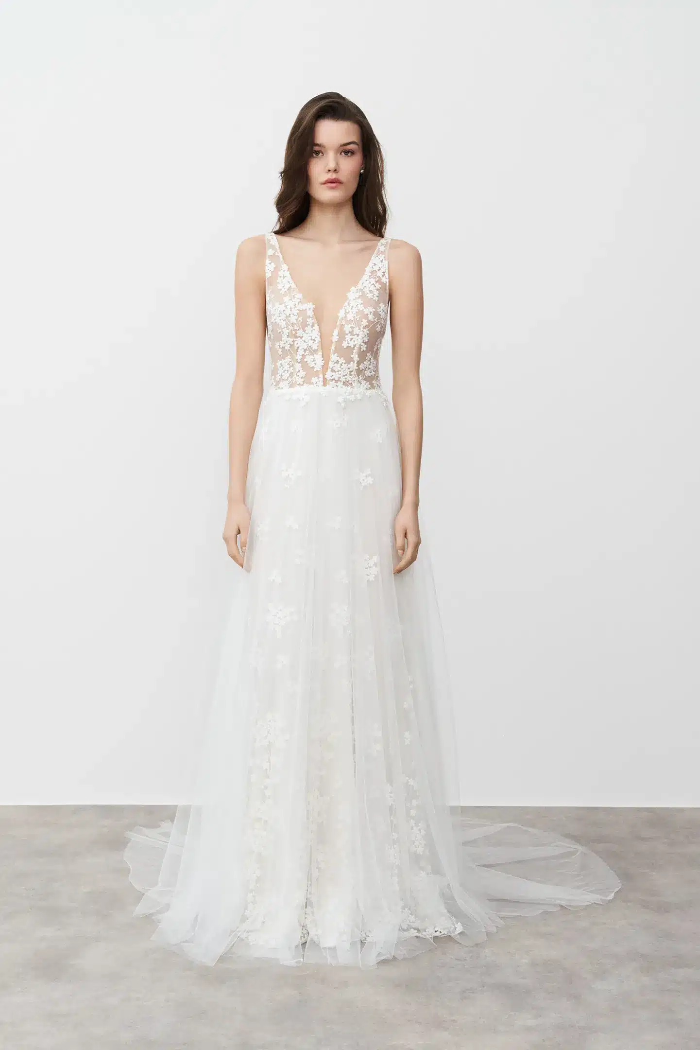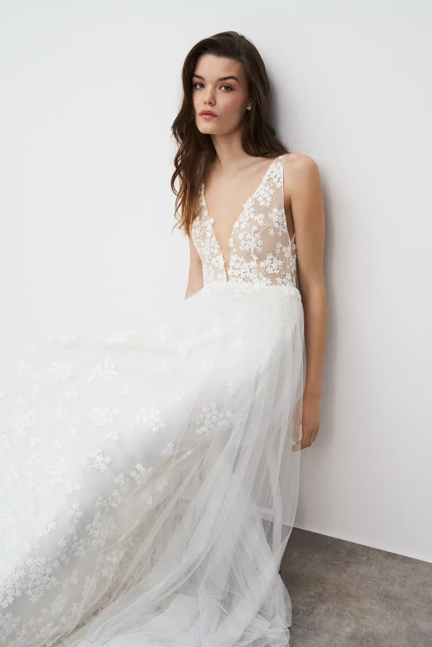 Mit dezenter Blumenstickerei vom Oberteil bis zum Rocksaum, anmutiger A-Linien-Silhouette und tiefem V-Ausschnitt ist dieses Kleid die perfekte Kombination aus Frische und purer Eleganz.