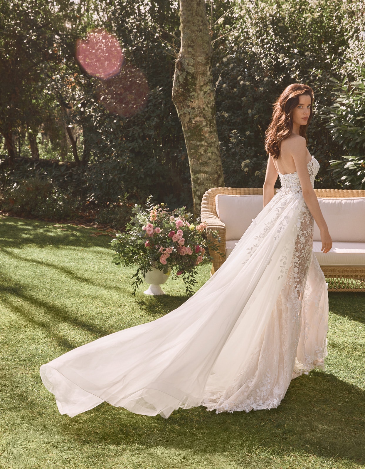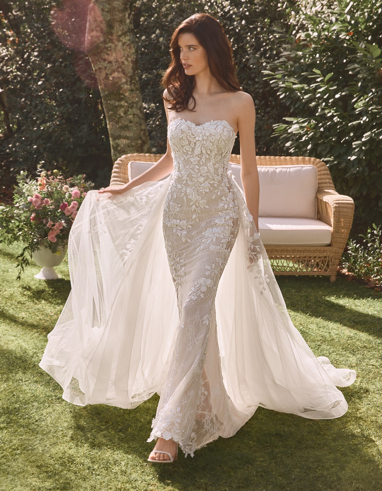 Modernes Meerjungfrauenkleid, das ein durchsichtiges Mieder mit herzförmigem Ausschnitt und zarten Spitzenapplikationen mit einem Tüllrock mit 3D-Blumenapplikationen kombiniert.