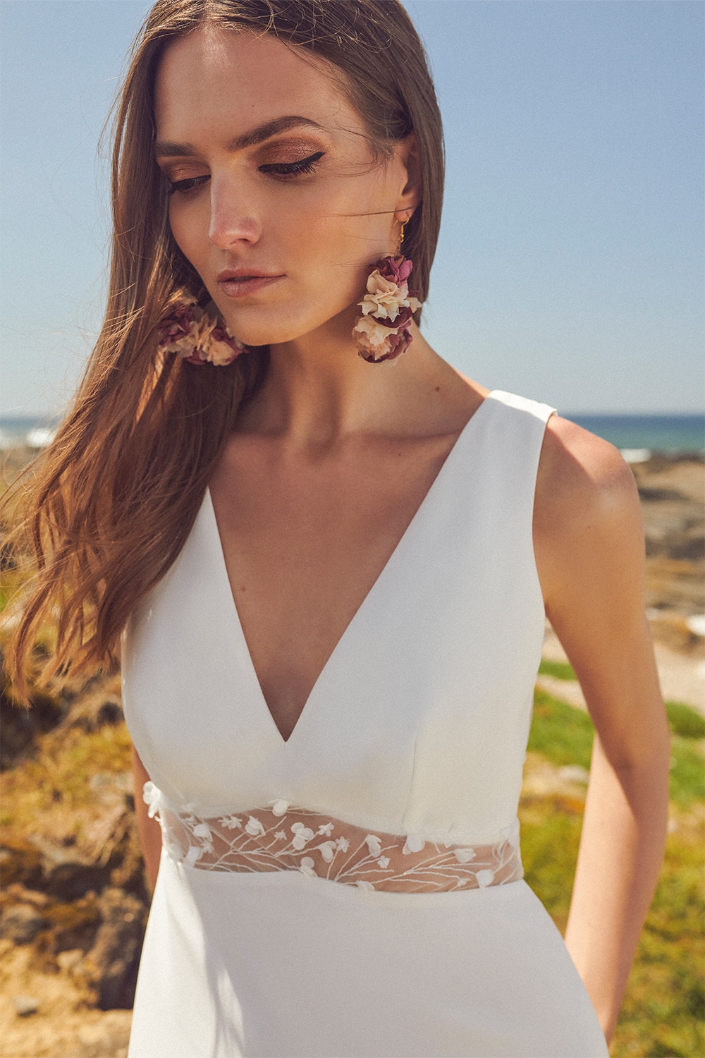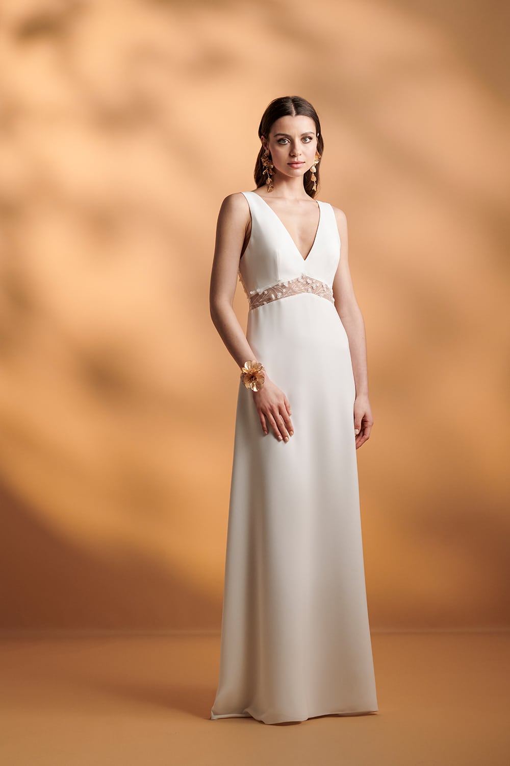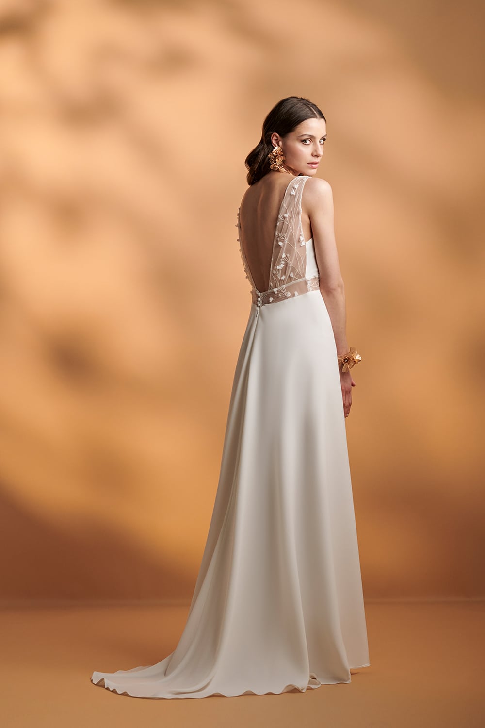 Ein elegantes Kleid aus nachhaltigem Krepp. Das Oberteil hat vorne und hinten einen V-Ausschnitt. Die Taille wird durch ein Band aus transparentem, mit Blumen besticktem Tüll betont. Die Rückseite des Kleides besteht aus dem gleichen Stoff wie die Taille. Der Rock hat eine leichte A-Linien-Passform mit einer kleinen Schleppe.