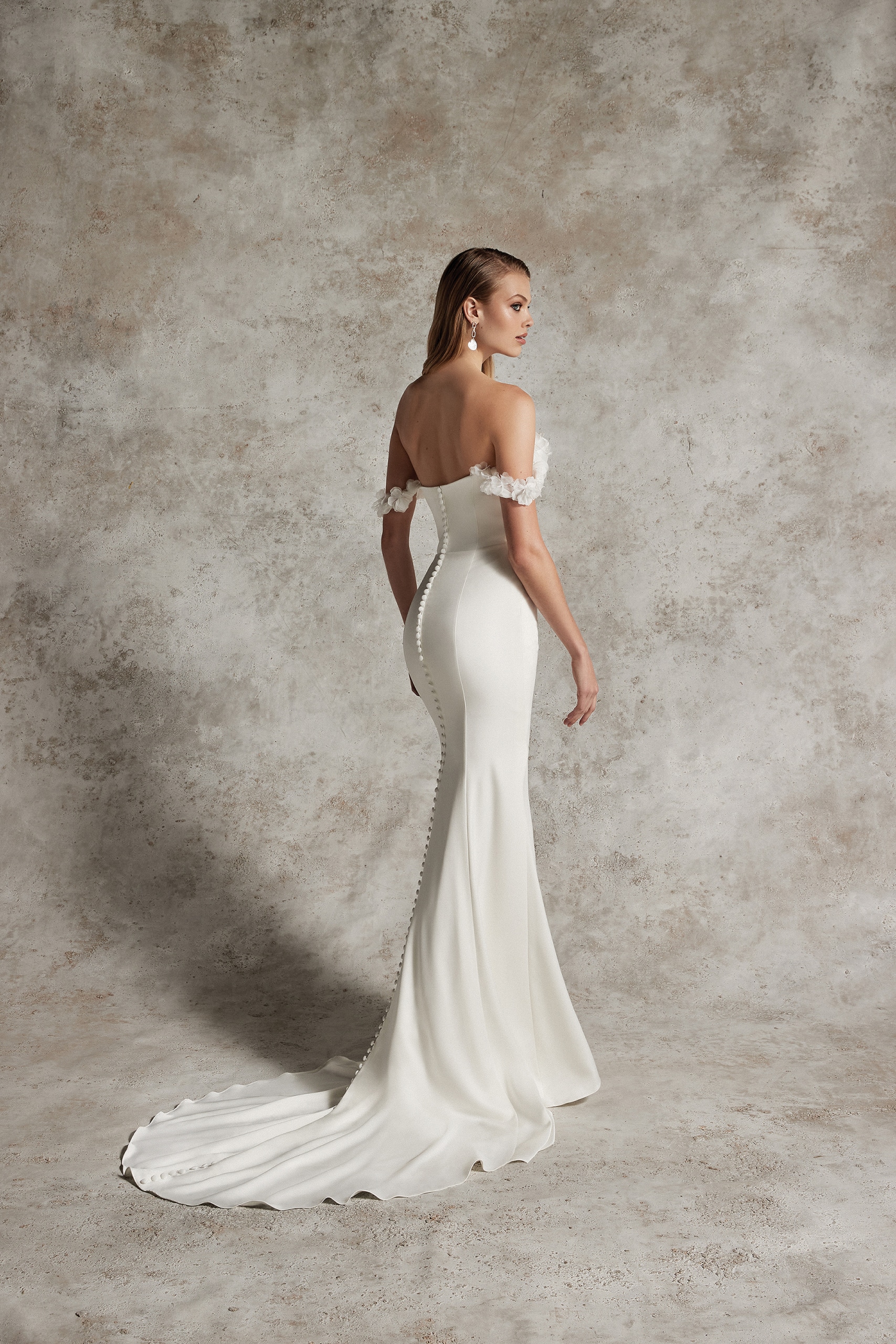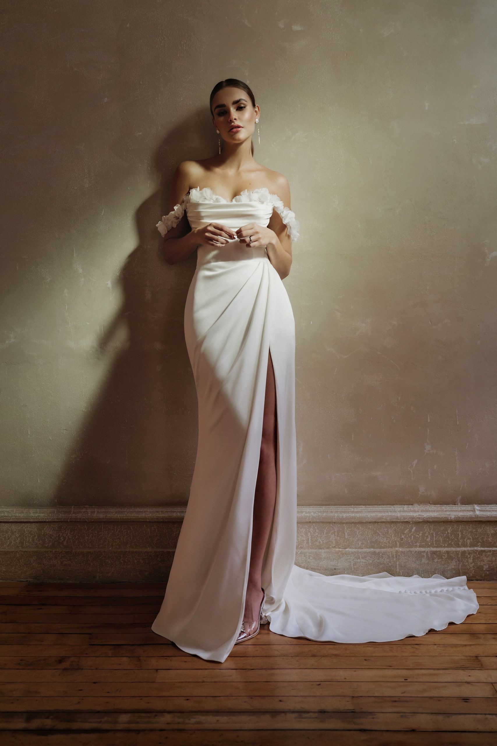 Schulterfreies Brautkleid mit 3D-Applikationen im Fit&Flare-Look