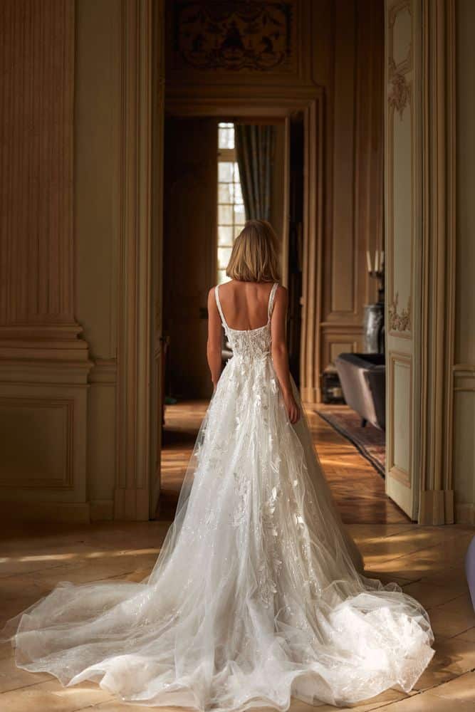 Verziertes A-Linien-Hochzeitskleid auf Trägern. Das Design ist aus Chantilly-Spitze mit Tüll-Overlay gefertigt und von Hand mit Blumenapplikationen und einem Paillettenmuster verziert. Mit einem quadratischen Ausschnitt Korsett auf breiten Trägern und einem vollen Rock, die anmutig in eine lange Schleppe erstreckt, einen Hauch von Verlockung hinzuzufügen.