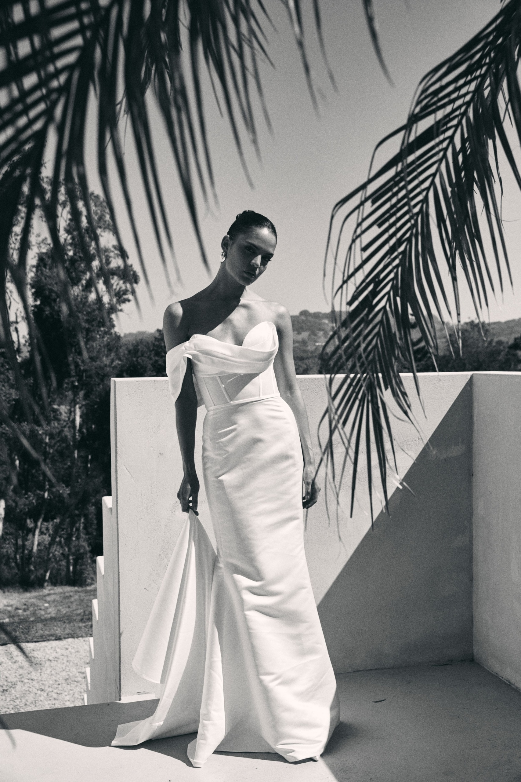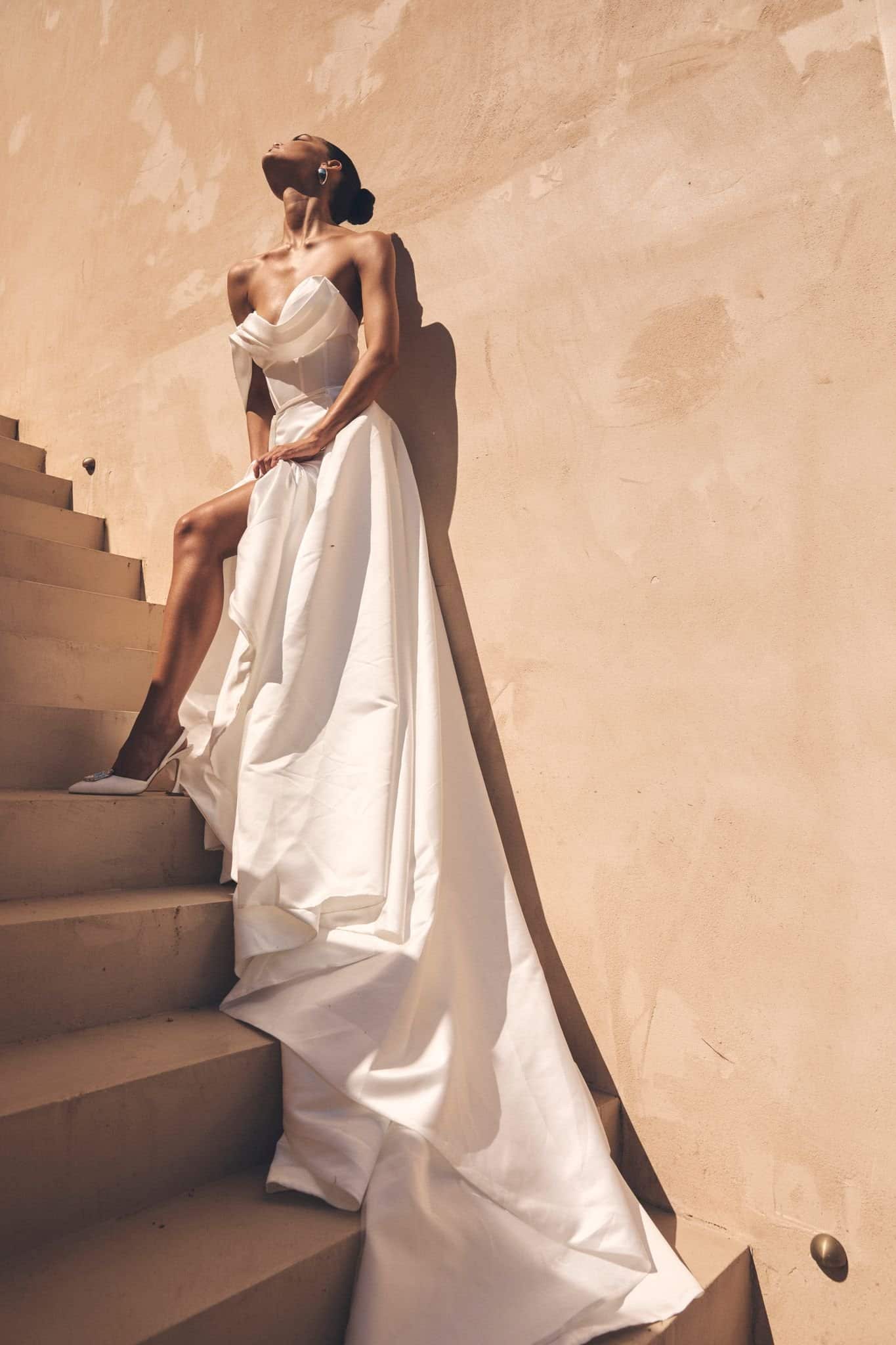 Das Portofino-Kleid verbindet moderne Schlichtheit mit anpassbarer Eleganz und ist perfekt für die Braut, die sich sowohl Raffinesse als auch Vielseitigkeit wünscht. Portofino verfügt über einen abnehmbaren Rock und seitlich drapierte Ärmel, so dass du den Look nach deinen Wünschen gestalten kannst.
