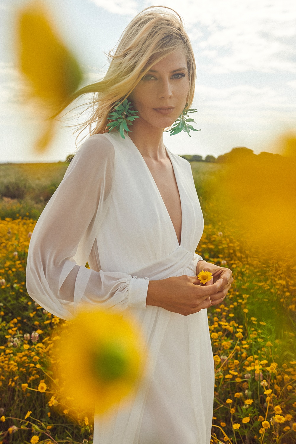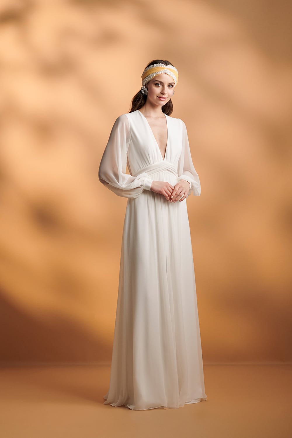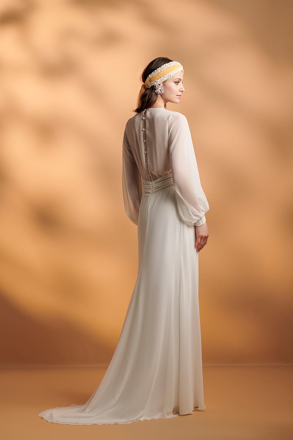 Dieses langärmelige Kleid ist aus Chiffon gefertigt. Die Rückseite hat Knöpfe und ist wie die Ärmel transparent. Die Vorderseite hat einen tiefen Ausschnitt und ein elfenbeinfarbenes Futter, das zum Rock passt. Das Kleid hat eine Schleppe.
