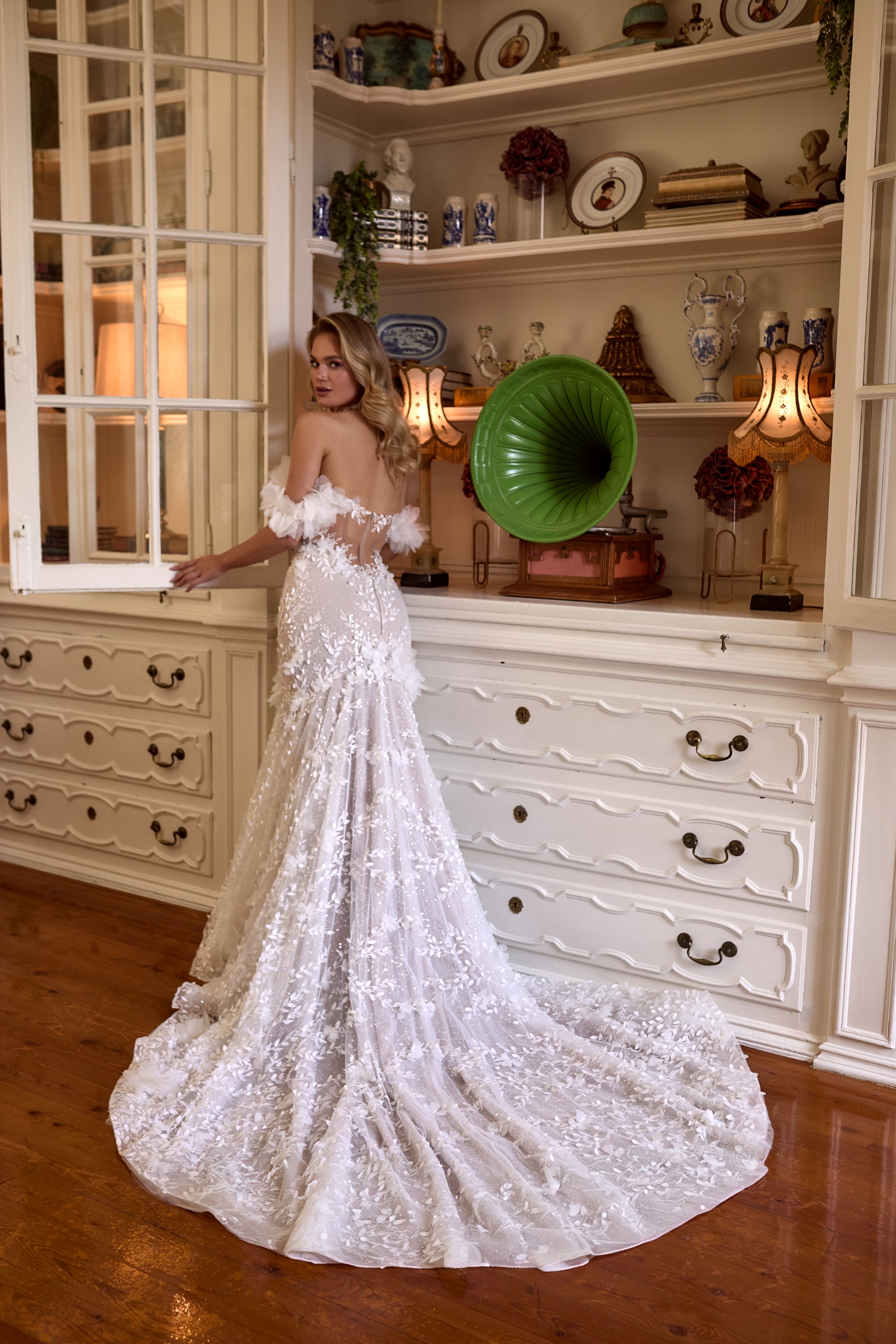 Dieses atemberaubende Modell vereint sinnliche Verführung und glamouröse Opulenz. Das figurbetonte Design schmeichelt deiner Silhouette und fließt in eine majestätische Schleppe aus. Der tiefe Ausschnitt und die verführerischen Off-Shoulder-Träger setzen dein Dekolleté perfekt in Szene. Die aufwendige 3D-Spitze und exquisite Stickereien verleihen dem Kleid eine luxuriöse Note und machen dich zum strahlenden Mittelpunkt deines großen Tages. Hochwertige Materialien und handgefertigte Details machen dieses Brautkleid zu einem wahren Meisterwerk der Couture.