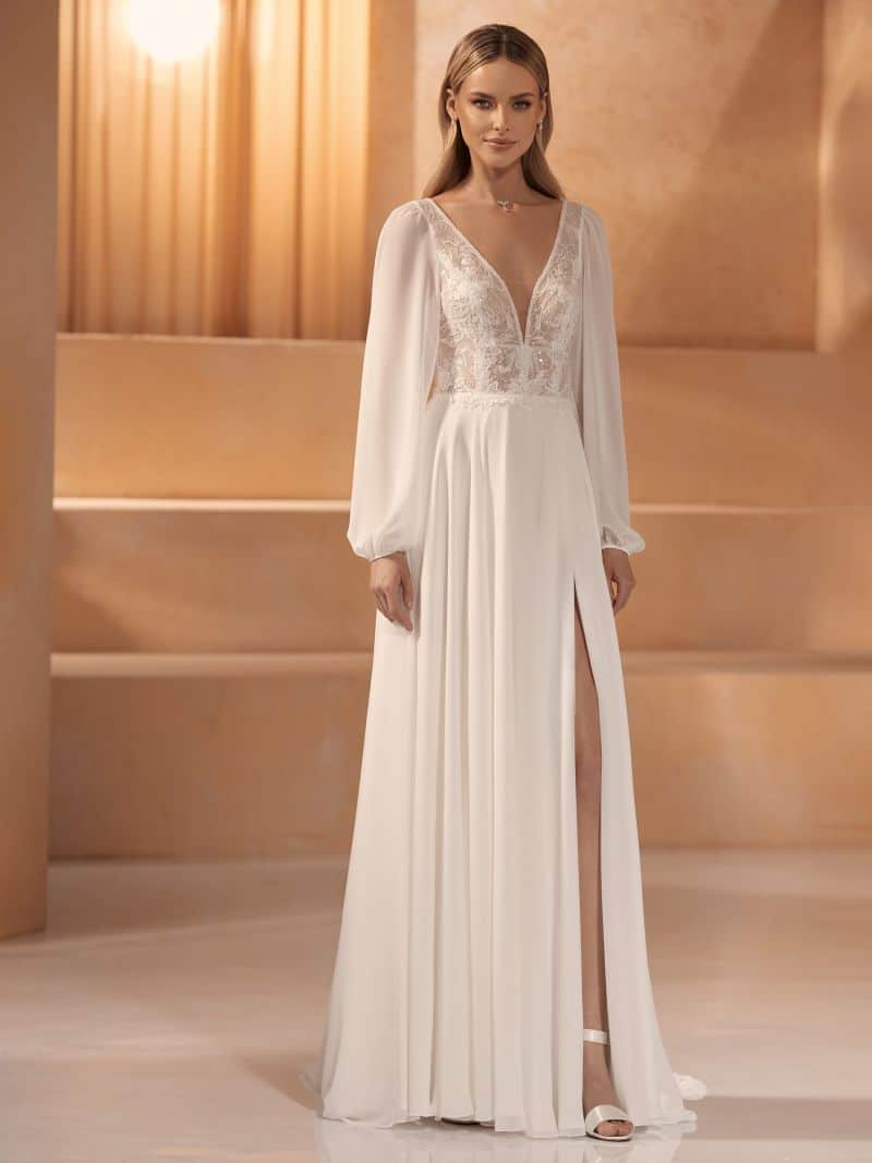 Ein modernes Kleid in A-Linie RAMONA ist perfekt für Bräute, die lange Ärmel bevorzugen. Dieses Kleid hat sowohl vorne als auch hinten einen V-Ausschnitt und ist mit floraler Spitze bestickt.