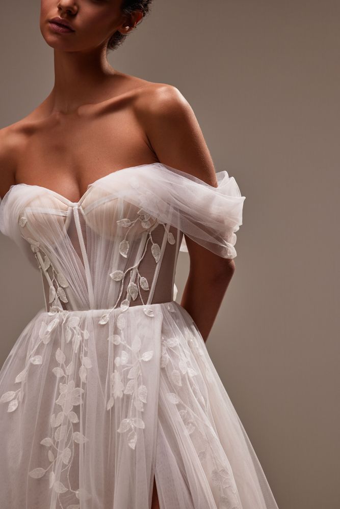 Bezauberndes schulterfreies Tüll-Hochzeitskleid, das virtuos mit handgefertigten, voluminösen Blumenapplikationen verziert ist. Ausgestattet mit einem Maxirock aus bauschigem Tüll mit langer Schleppe, einem herzförmigen Korsettmieder mit schulterfreien Tüllärmeln, die an der Schleife am Rücken gebunden werden können, und einem Schnürverschluss mit Tüll.