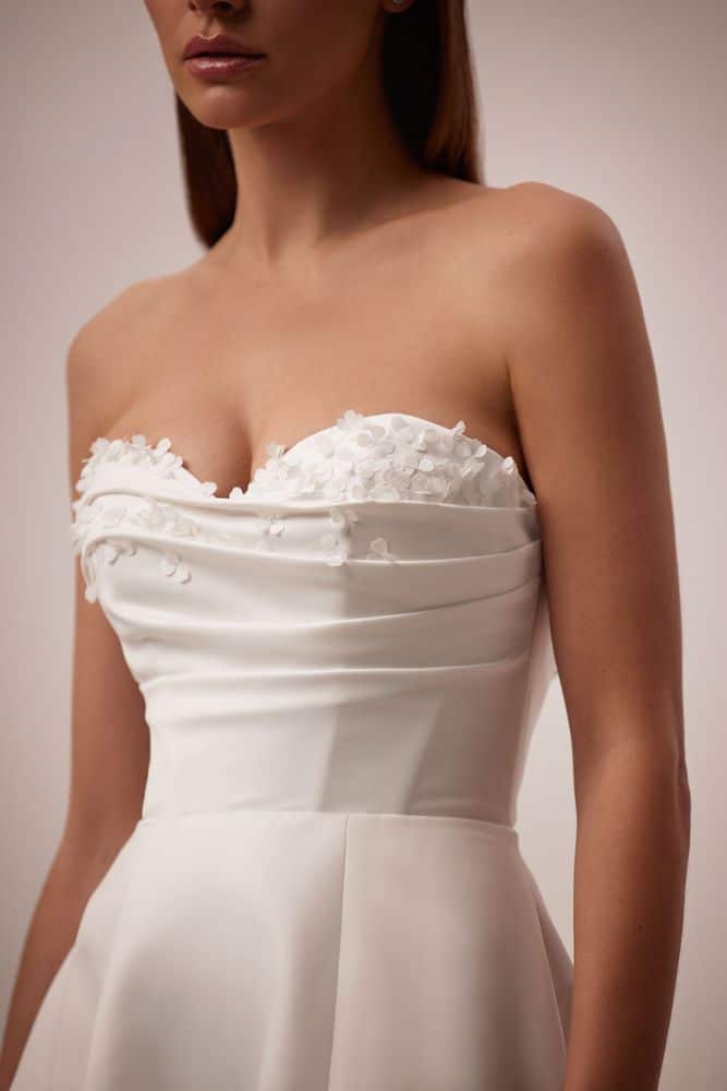 Romantisches Hochzeitskleid aus Satin, das am herzförmigen Ausschnitt mit kleinen Blumen verziert ist. Ausgestattet mit einem Korsett mit Stäbchen, Reißverschluss am Rücken und einem langen Rock mit Schleppe. Kann mit einem halbtransparenten, langärmeligen Tüllbolero, der mit 3D-Blumen verziert ist, oder einem verträumten Tüllschleier mit 3D-Blumen ergänzt werden.