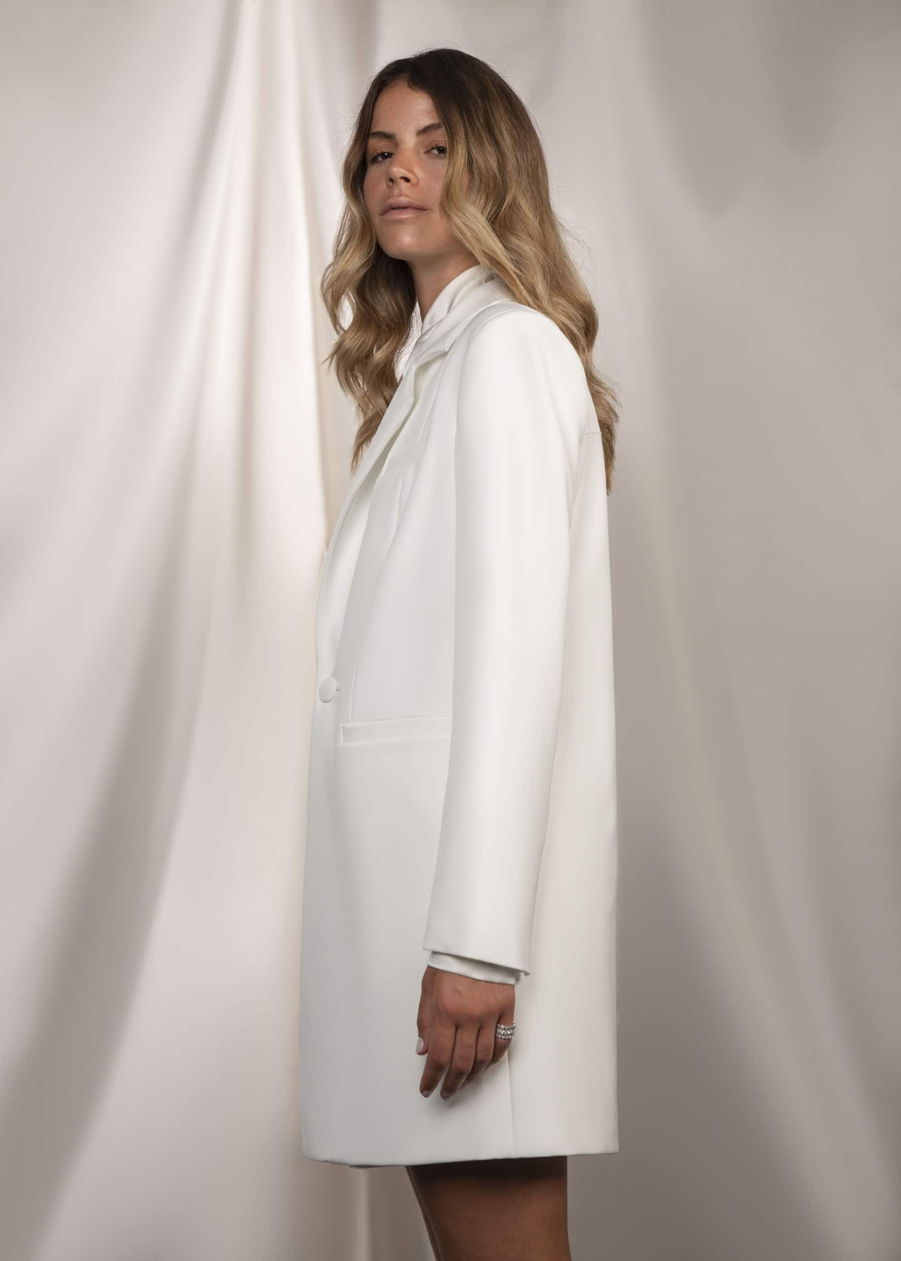 Unkonventionell und stilvoll, bietet einen verlängerten Blazer mit kurzen Shorts. Der übergroße Blazer, der aus recyceltem Polyester-Crêpe-Stoff handgenäht wurde, verfügt über inspirierte Herrenschneiderei-Details, während die Shorts mit einem Seitenschlitz für Komfort sorgen.