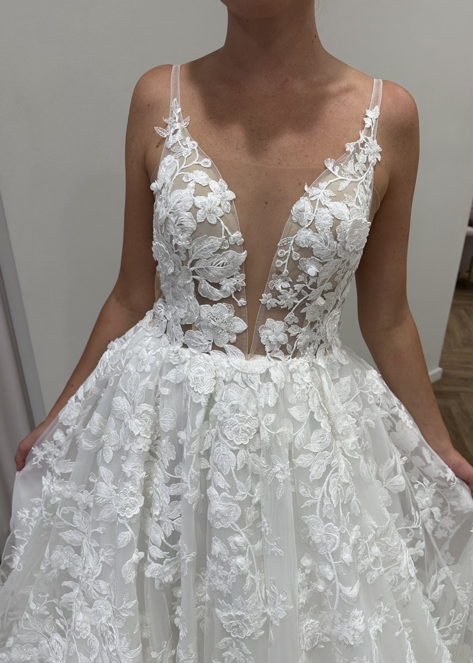 Das Oberteil bezaubert mit zarten, floralen Spitzenapplikationen, die dem Design eine verträumte Note verleihen. Der tiefe V-Ausschnitt vorne setzt ein stilvolles Statement, während der tiefe, offene Rücken einen Hauch von Sinnlichkeit ausstrahlt. Der voluminöse Tüllrock rundet das Kleid ab und sorgt für einen atemberaubenden Auftritt.
