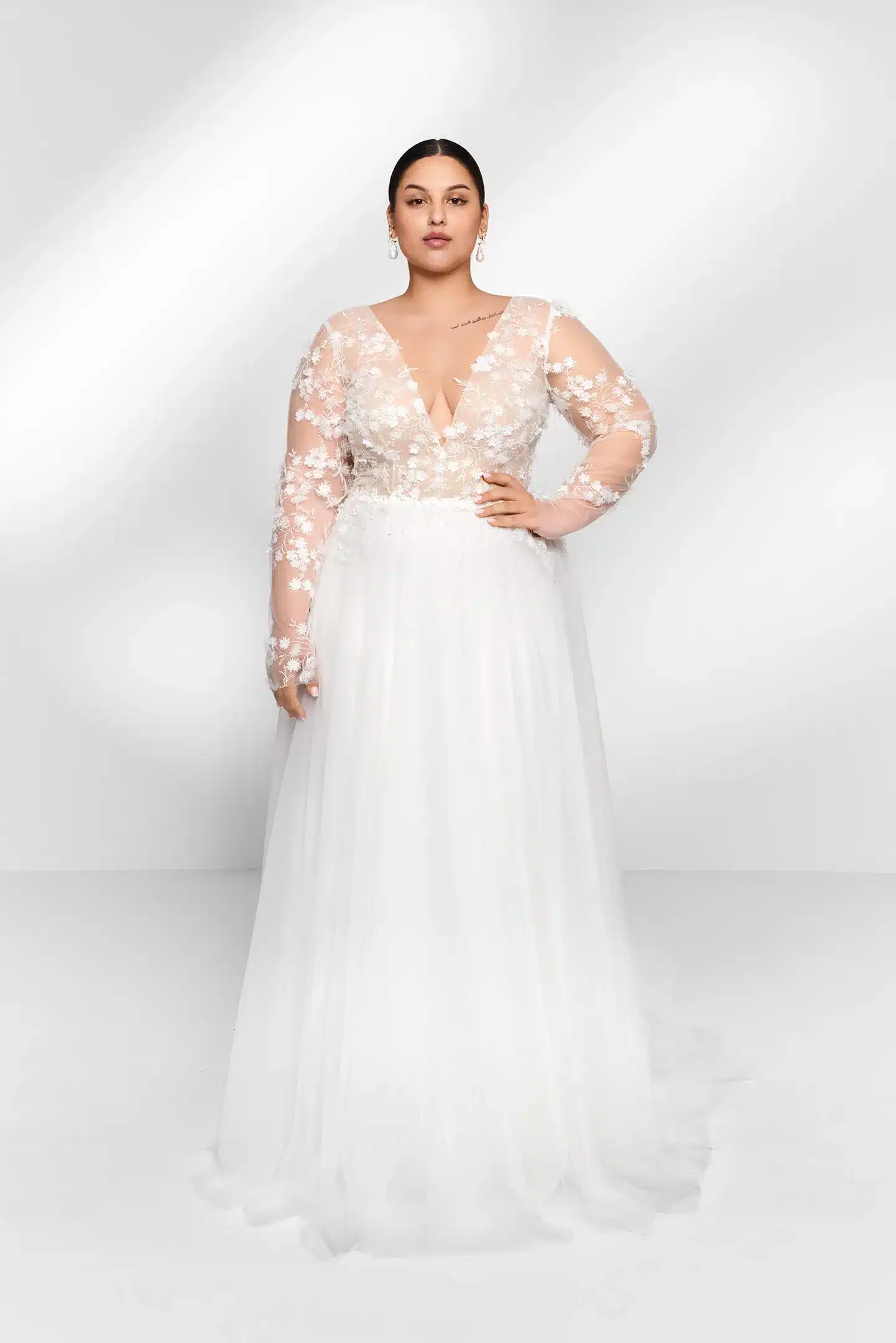 Taillierte, ätherische Ärmel mit botanischen Stickereien, ein tiefer V-Ausschnitt und ein offener Rücken, der durch einen klassischen Tüllrock ausgeglichen wird.