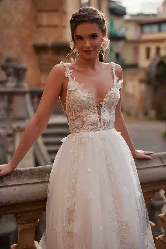 Komplexe florale Spitzenmuster und ein wunderschöner gewebter Tüll-Überrock – vollständig von Hand genäht. Mit einem leicht tiefen, v-förmigen Ausschnitt, der von einem nudefarbenen Mesh-Futter überlagert wird, und einem freizügigen Rückenausschnitt unterstreicht dieser Stil die verführerische, anspruchsvolle und verspielte Braut. Für das passende Drama sorgt die lange Schleppe aus schimmernder 3D-Spitze mit Stickerei.