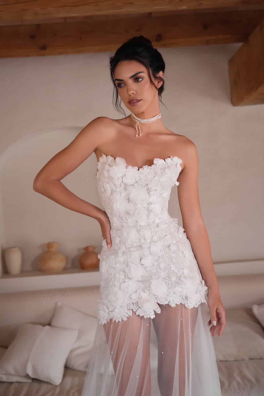Verwandle deinen großen Tag in einen glamourösen Auftritt mit diesem außergewöhnlichen Brautkleid! Die kurze-lang Optik kombiniert das Beste aus beiden Welten: Ein elegantes, kurzes Kleid mit detailverliebter 3D-Spitze, das sanft in einen transparenten Tüllrock übergeht. Der Rock ist dezent mit wenigen Perlen besetzt, was deinem Look eine zarte und edle Note verleiht. Als besonderes Highlight findet sich die filigrane Spitze an der Schleppe wieder, die deinen Auftritt atemberaubend abrundet. Dieses Brautkleid sorgt dafür, dass du dich wie eine echte Königin fühlst – extravagant, einzigartig und absolut bezaubernd!