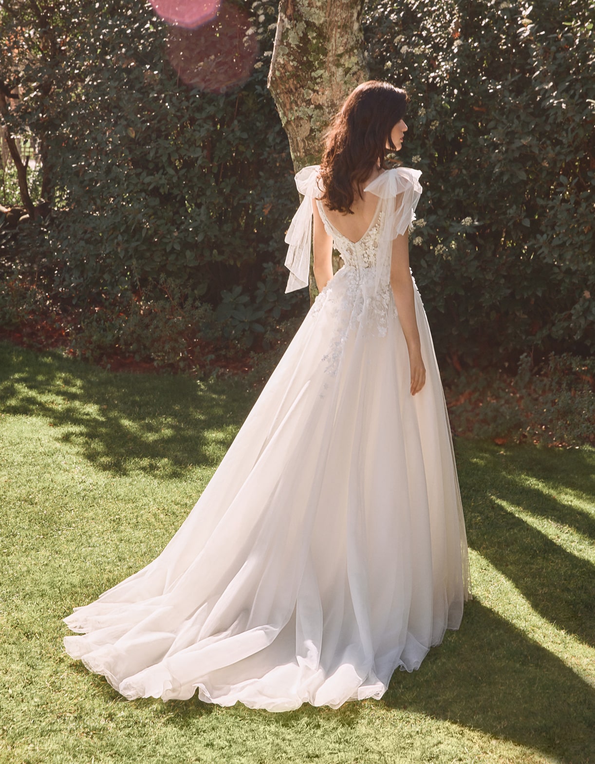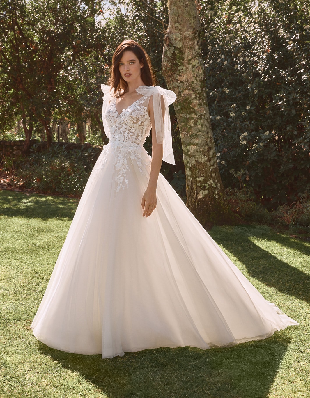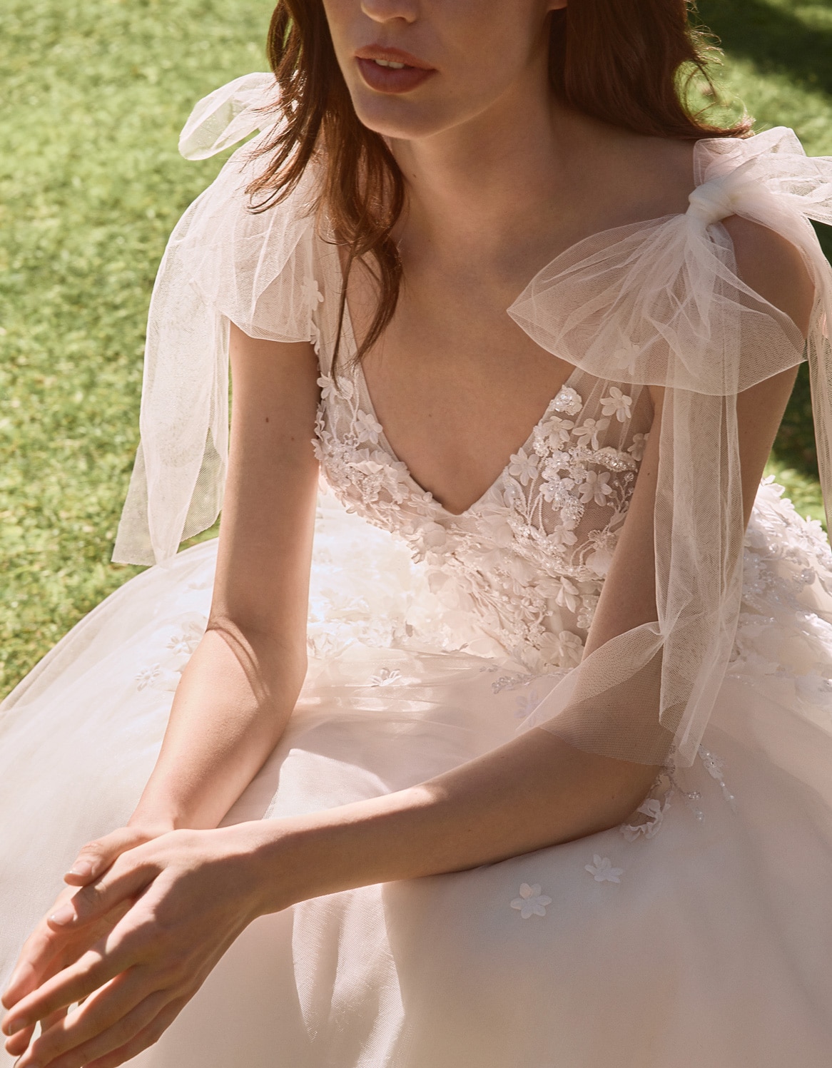 Romantisches Prinzessinnenkleid, das ein tailliertes Mieder und einen V-Ausschnitt mit zarten 3D-Blumenapplikationen auf einem Tüllrock kombiniert.