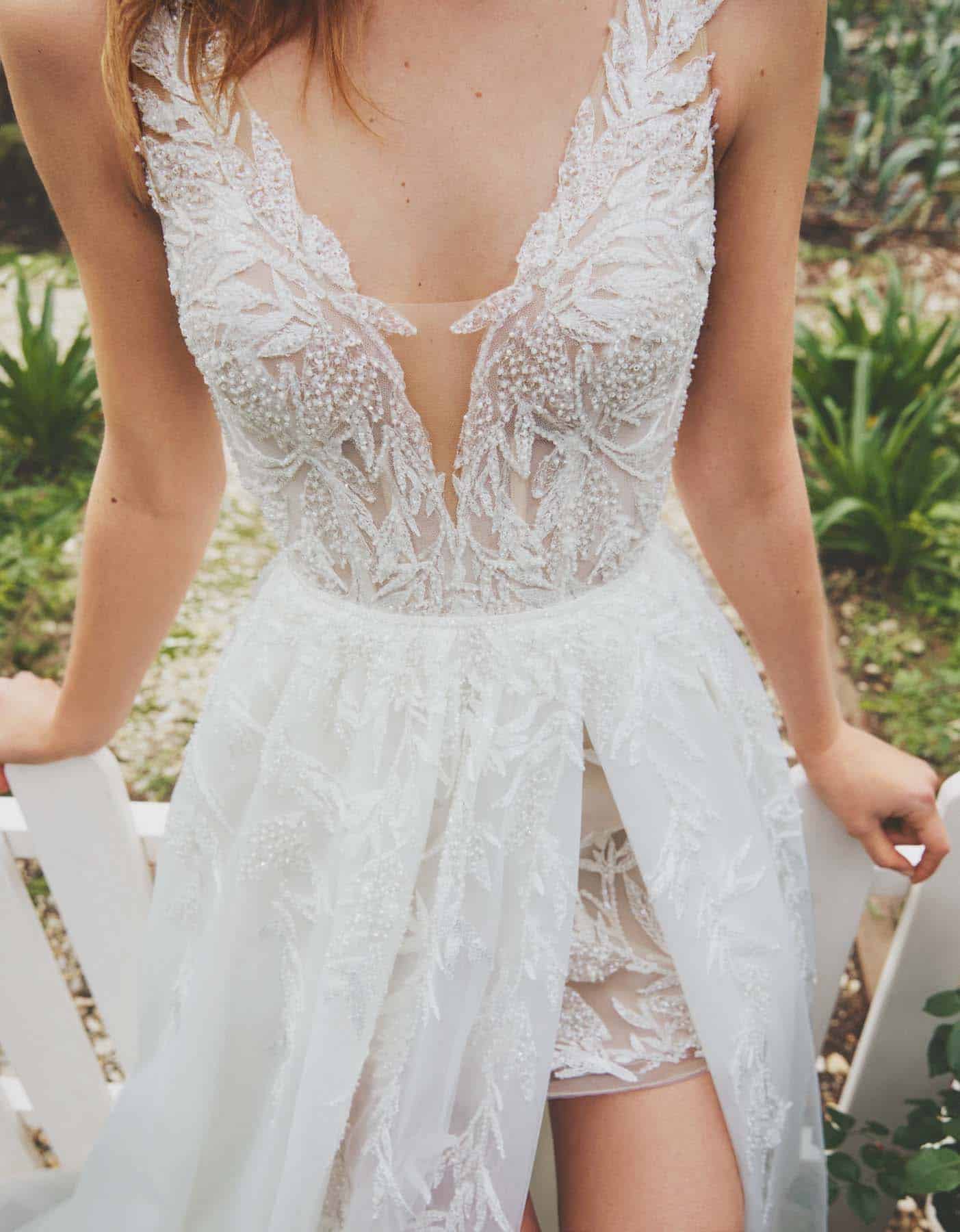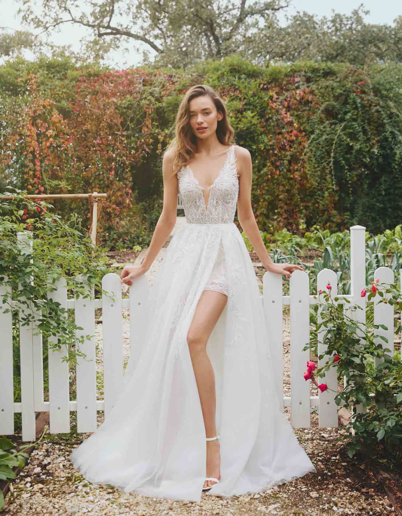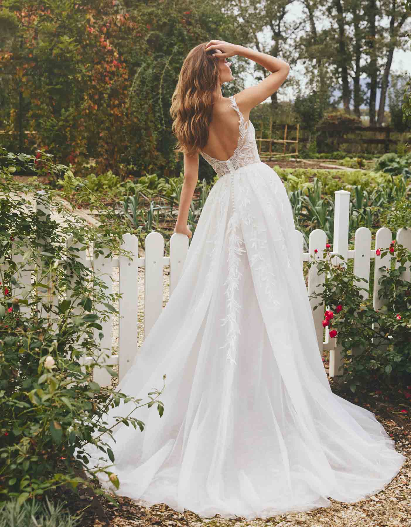 Dieses Kleid bietet eine moderne Interpretation der klassischen A-Linien-Silhouette. Das moderne Design mit zart schimmernden Blumenapplikationen auf seidigem Tüll wirkt wie ein zweiteiliges Kleid mit einem offenen Überrock über einem kurzen Kleid. Die Silhouette wird durch ein Korsettmieder mit Rundhalsausschnitt und offenem Rücken betont.