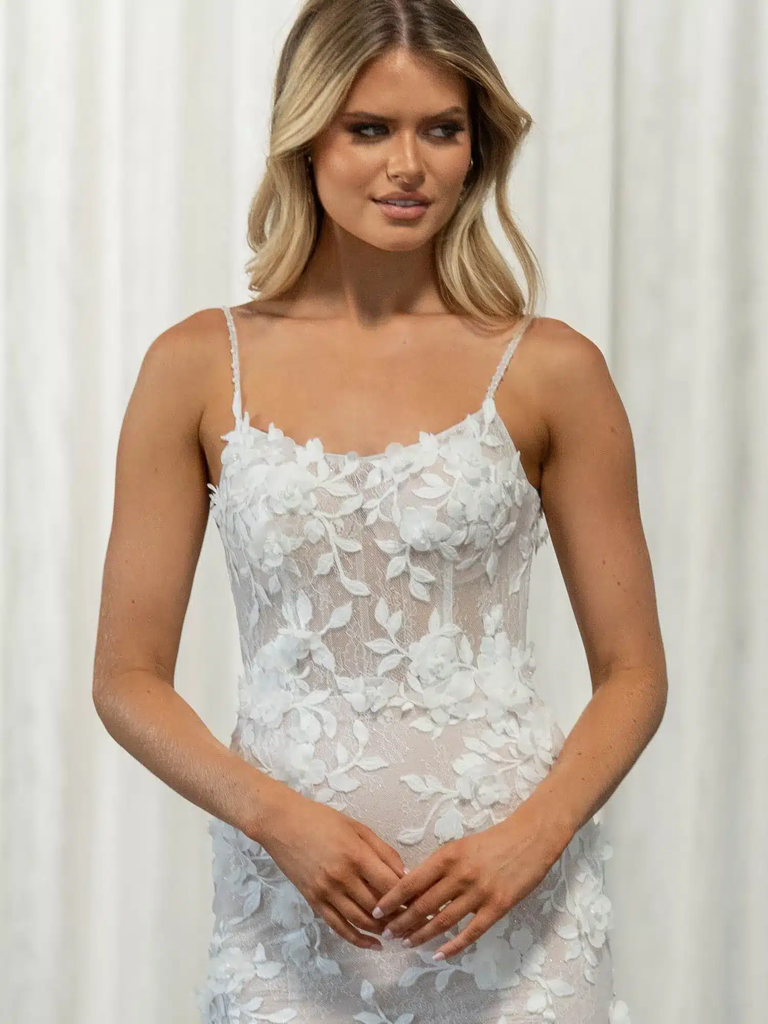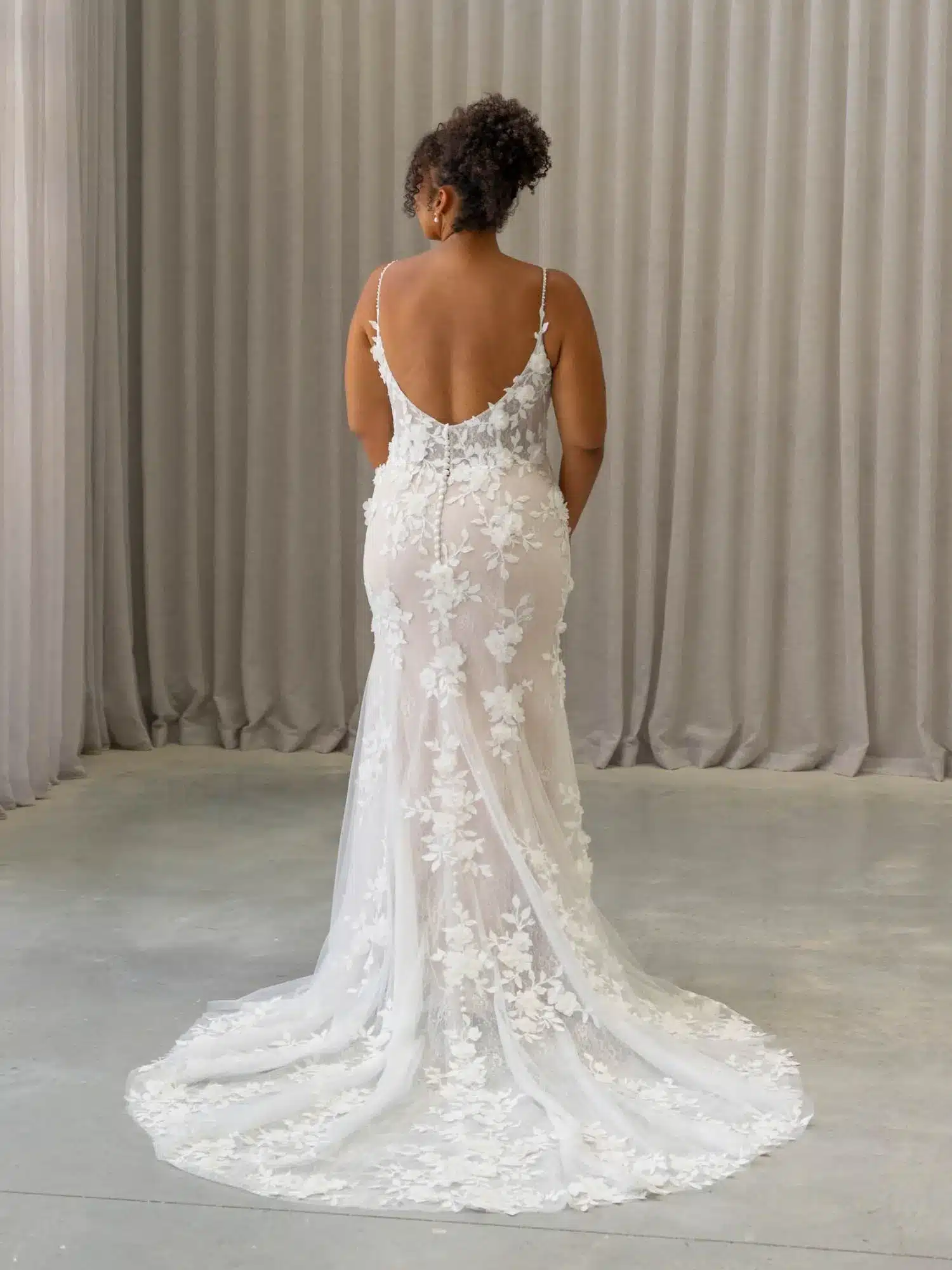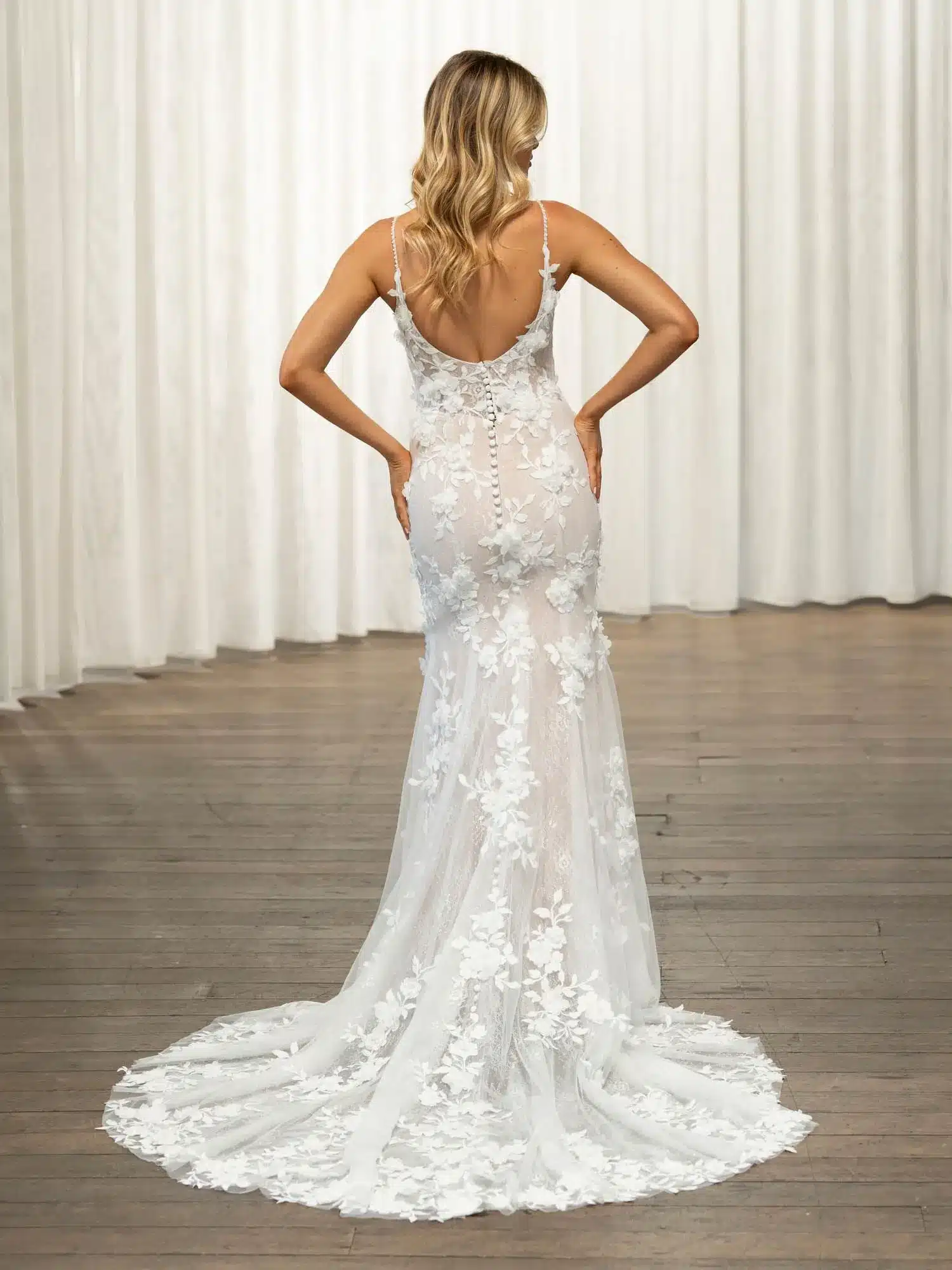 Zarte Lagen feinster bestickter Chantilly-Spitze mit Tüll darunter bilden einen äußerst weichen, femininen Rahmen. Paillettenbesetzte Blumenmotive verleihen zusammen mit feinen Perlenträgern eine besonders verträumte Note. </span><span>Der moderne Rundhalsausschnitt wird durch die Stäbchenkonstruktion in dem Illusionsmieder gestützt. Die asymmetrische Motivanordnung durch den Rock auf der Vorder- und Rückseite streckt den Körper</span><span>. </span><span>Auf der Rückseite endet das transparente Mieder großzügig über der Taille, mit Knöpfen in der Mitte des Rückens, die sich bis zum unteren Teil fortsetzen. Das charakteristische Motivdetail setzt sich am Rock und durch die Schleppe aus Illusionsspitze fort.