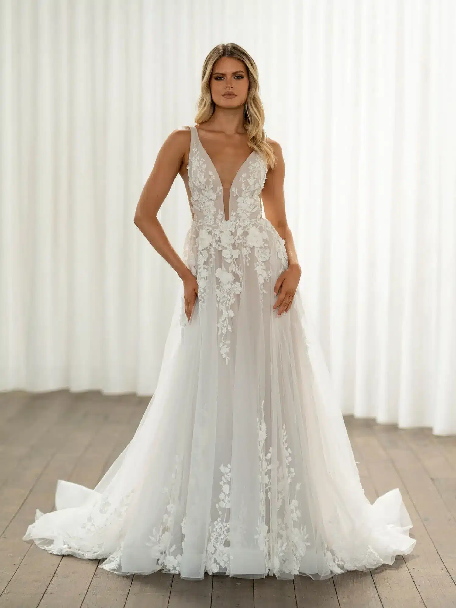 Das Tatiana-Kleid hat einen tiefen V-Ausschnitt, Seitenteilen aus transparentem Illusionstüll und einen tiefen, runden Rückenausschnitt. Die botanisch inspirierten, gestickten Pailletten- und Perlenspitzenmotive sind in einem linearen Muster angeordnet, um die sexy V-förmigen Details des Oberteils zu ergänzen und in ihren fließenden A-Linien-Rock überzugehen.