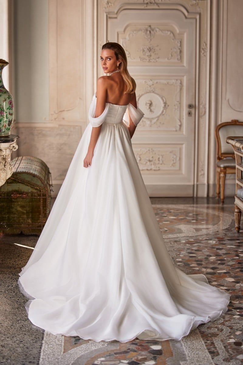 Ein luftiges schulterfreies Kleid in A-Linie hat eine lange Schleppe aus elfenbeinfarbenem Organza. Das Mieder ist mit Drapierungen und kurzen abgesenkten Ärmeln verziert. Das Kleid ist mit voluminösen Blumen verziert und von Hand mit Perlen bestickt. Die Taille wird durch einen perlenbestickten Gürtel hervorgehoben. Der bauschige Rock ist hoch geschnitten.
