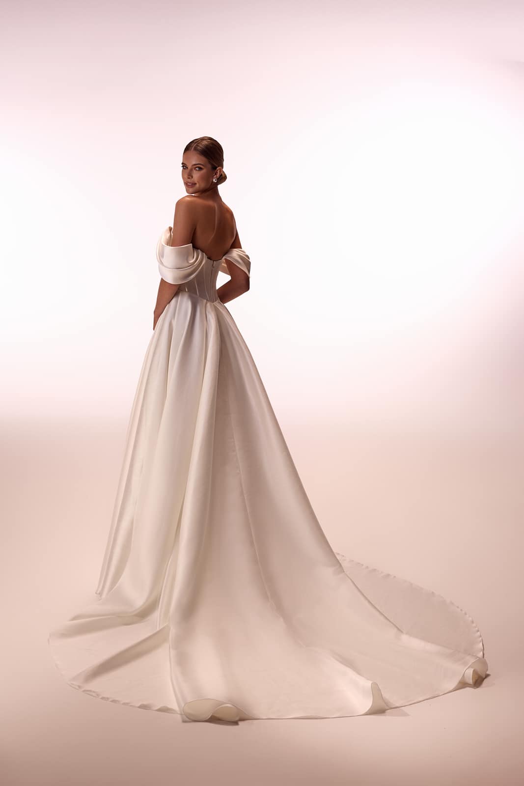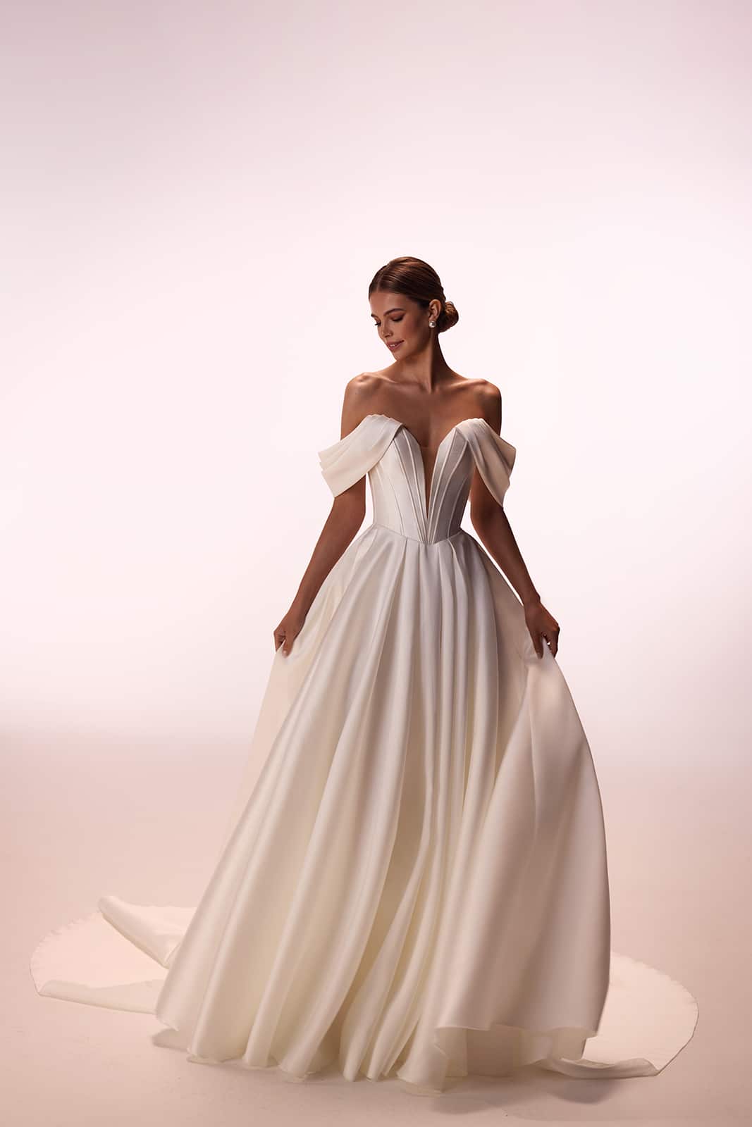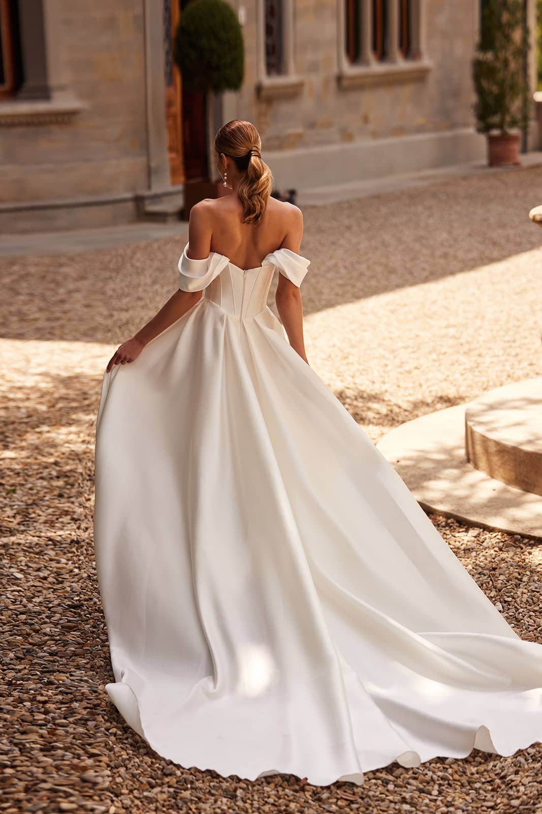 Elfenbeinfarbener Satin und champagnerfarbene Details machen dieses klassisch-kontemporäre Kleid zur idealen Wahl für dich, wenn du eine Märchenhochzeit leben möchtest. Ein fein strukturiertes Korsett, mit Linien, die denen einer Skulptur gleichen, unterstreicht die Silhouette mit entschlossener Weichheit. Die drapierten Träger lassen die Schultern frei, während ein tiefer V-Ausschnitt die Taille akzentuiert. Die Kathedralenschleppe und der voluminöse Rock sind majestätisch und verleihen dem Brautkleid Thalia eine Eleganz, die sich mit dem modern-zeitlosen Konzept der einfachen und durchdachten Details paart.