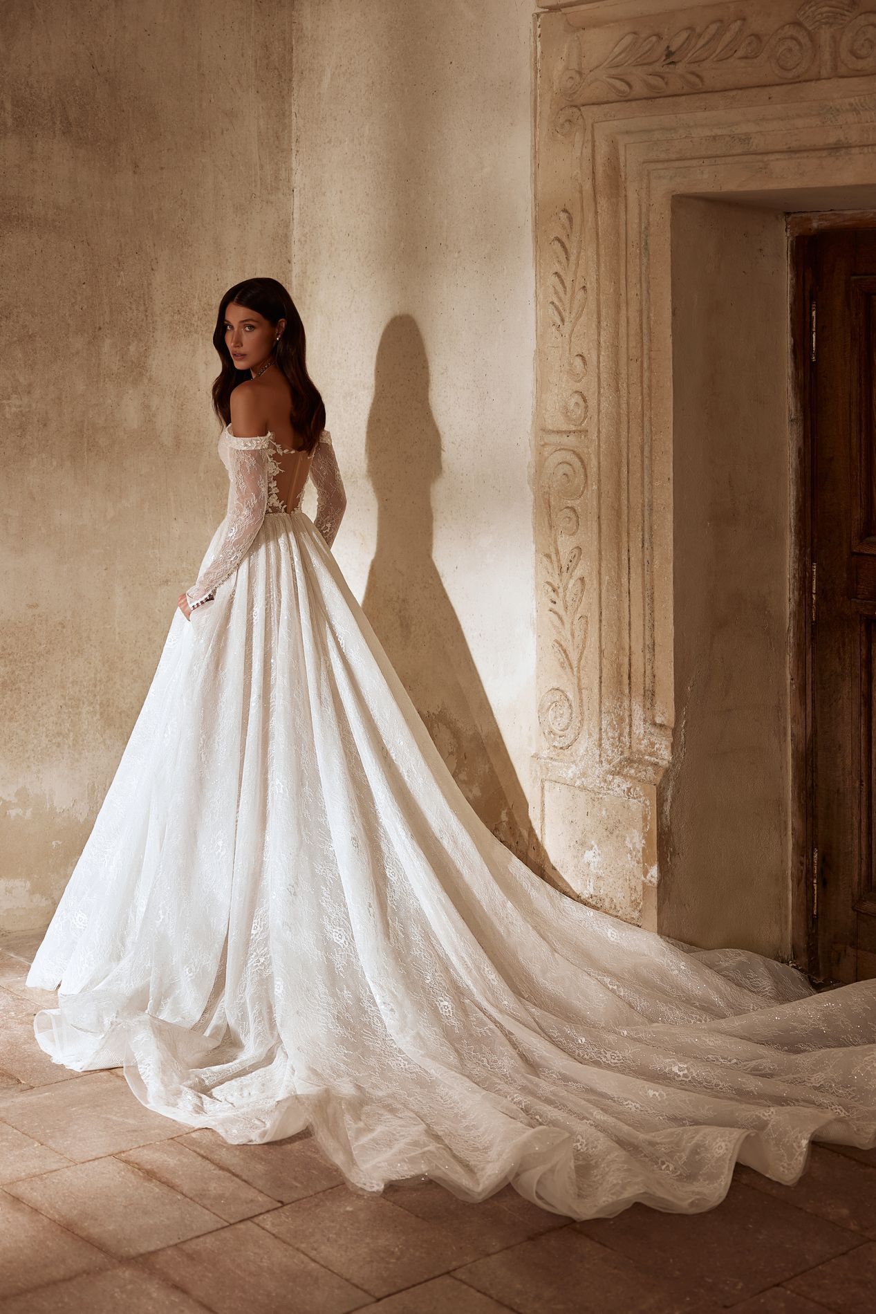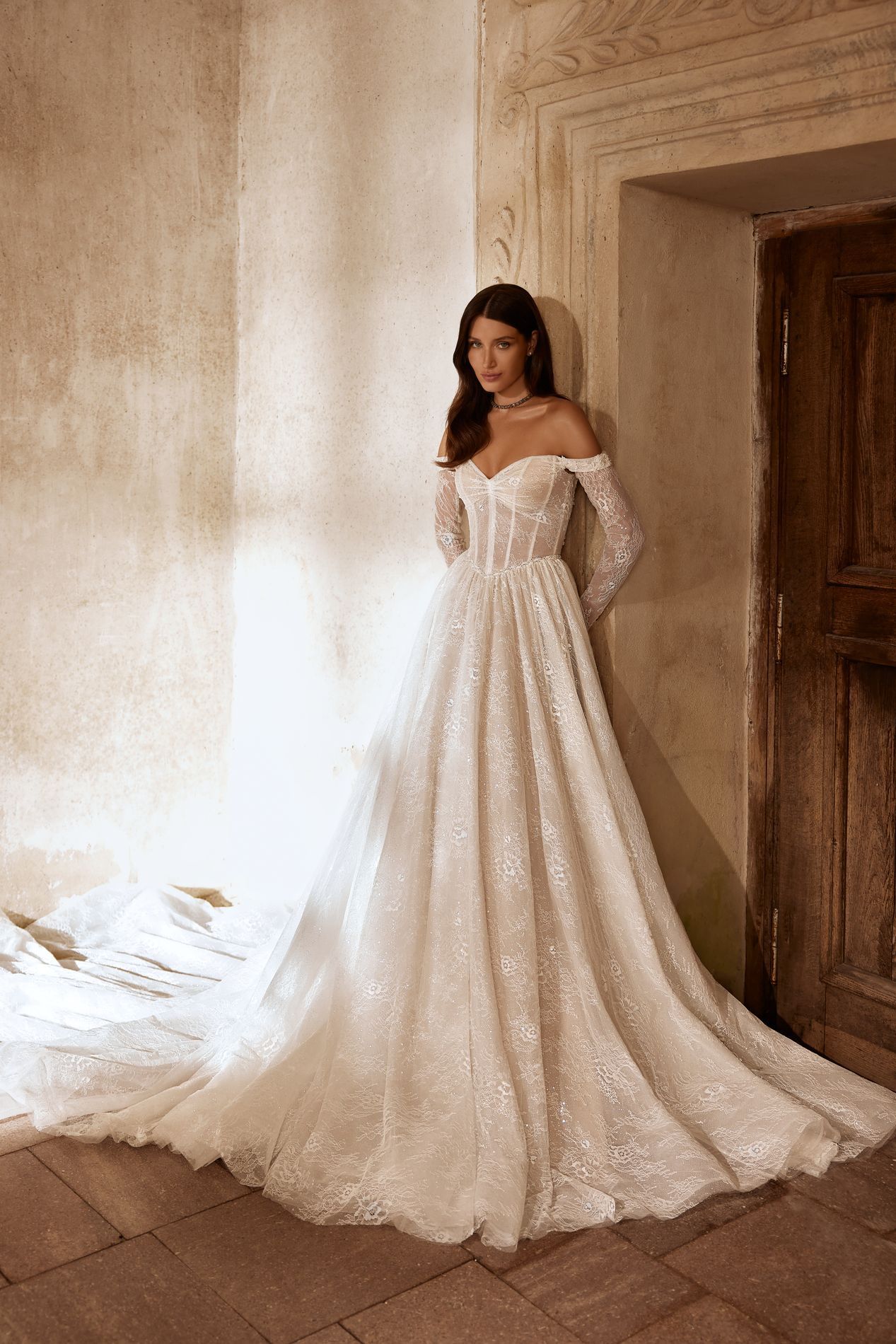 Die luxuriöse Spitze scheint wie geschaffen für dieses Kleid. Ihr dezenter Schimmer und die zarten Linien des Musters machen es zu einem wahrhaft königlichen Kleid. Der Stil verleiht Eleganz, während die abnehmbaren Ärmel Ihr Kleid leicht von formell zu kokett verwandeln können.