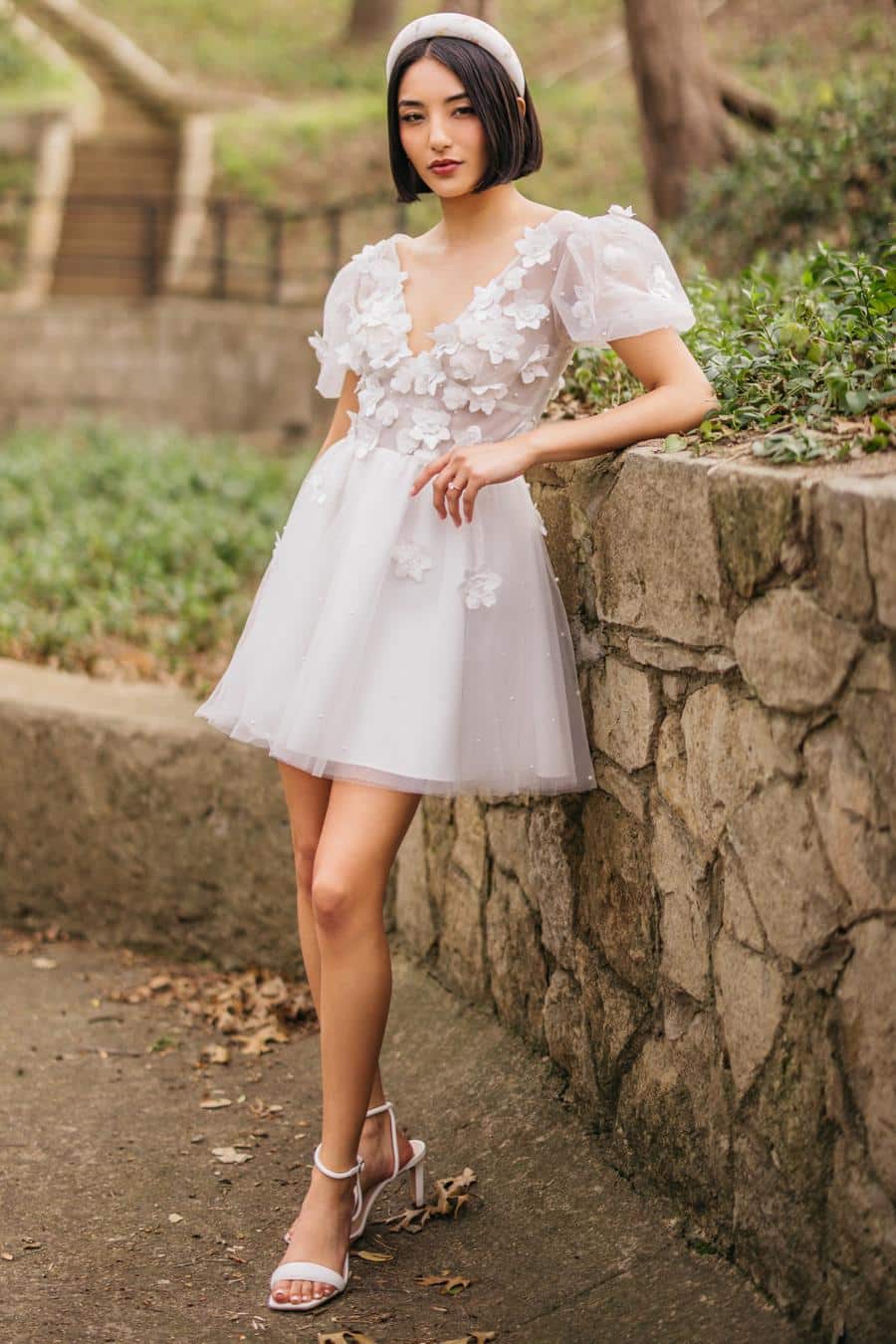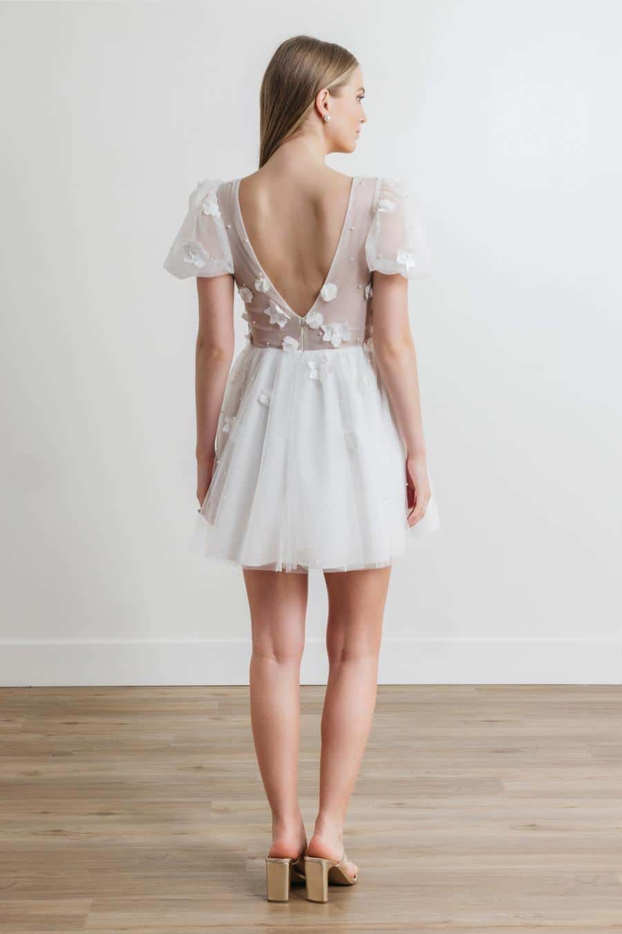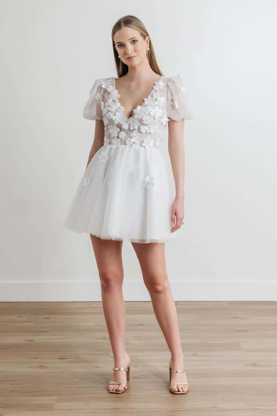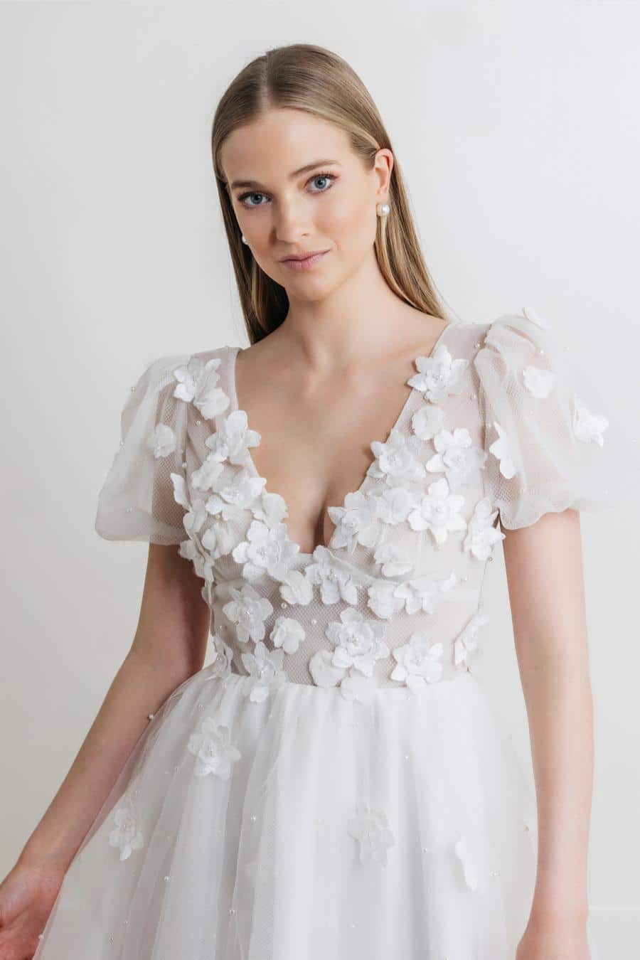 Tulip verbindet verspielte Schönheit mit klassischer Romantik. Du wirst die Art und Weise lieben, wie die gestickten 3-D-Blüten über das halbdurchsichtige Mieder und den Tüllrock flattern. Perfekt für Verlobungsfotos oder zum Hineinzwirbeln in deine After-Party!