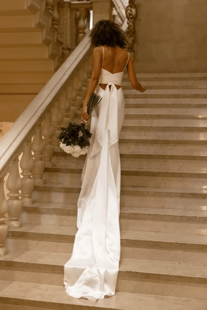 Valentina spiegelt die Zartheit der Weiblichkeit wider. Dieses elfenbeinfarbene Satin-Hochzeitskleid besticht durch seine flüssige Geschmeidigkeit, während ein vielfältiges Rückenband mit glatter Oberfläche und mühelosem Faltenwurf für Individualität sorgt.
