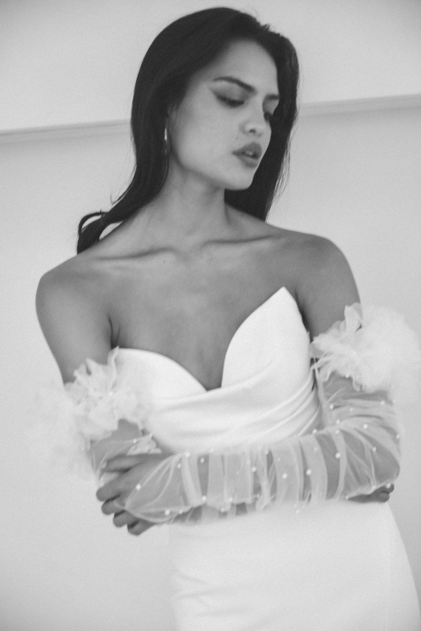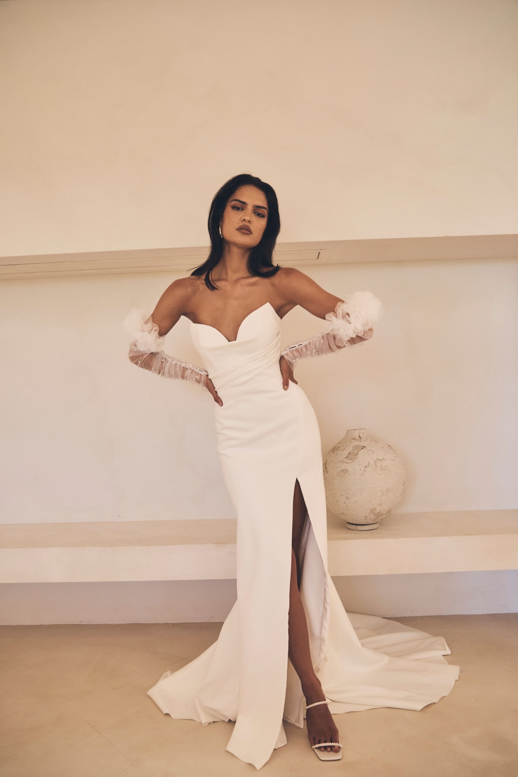 Das Valley-Kleid verkörpert mit seinem schlichten Design und den zeitgenössischen Details moderne Eleganz. Das schlichte Design eignet sich perfekt, um es mit unseren charakteristischen JH-Handschuhen oder deinen Lieblingsohrringen auszustatten – perfekt für die modebewusste Braut, die das Kleid zu ihrem eigenen machen möchte.