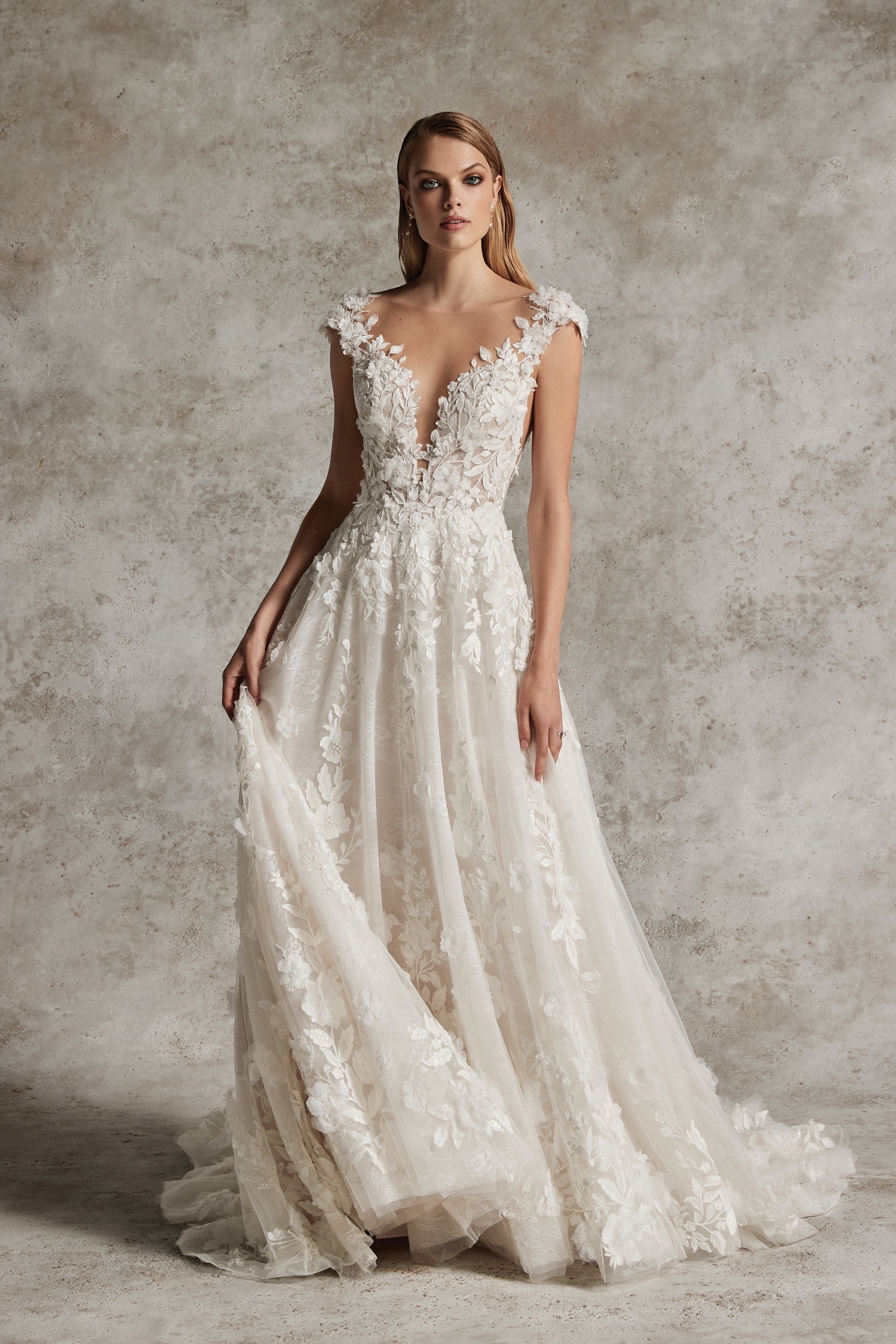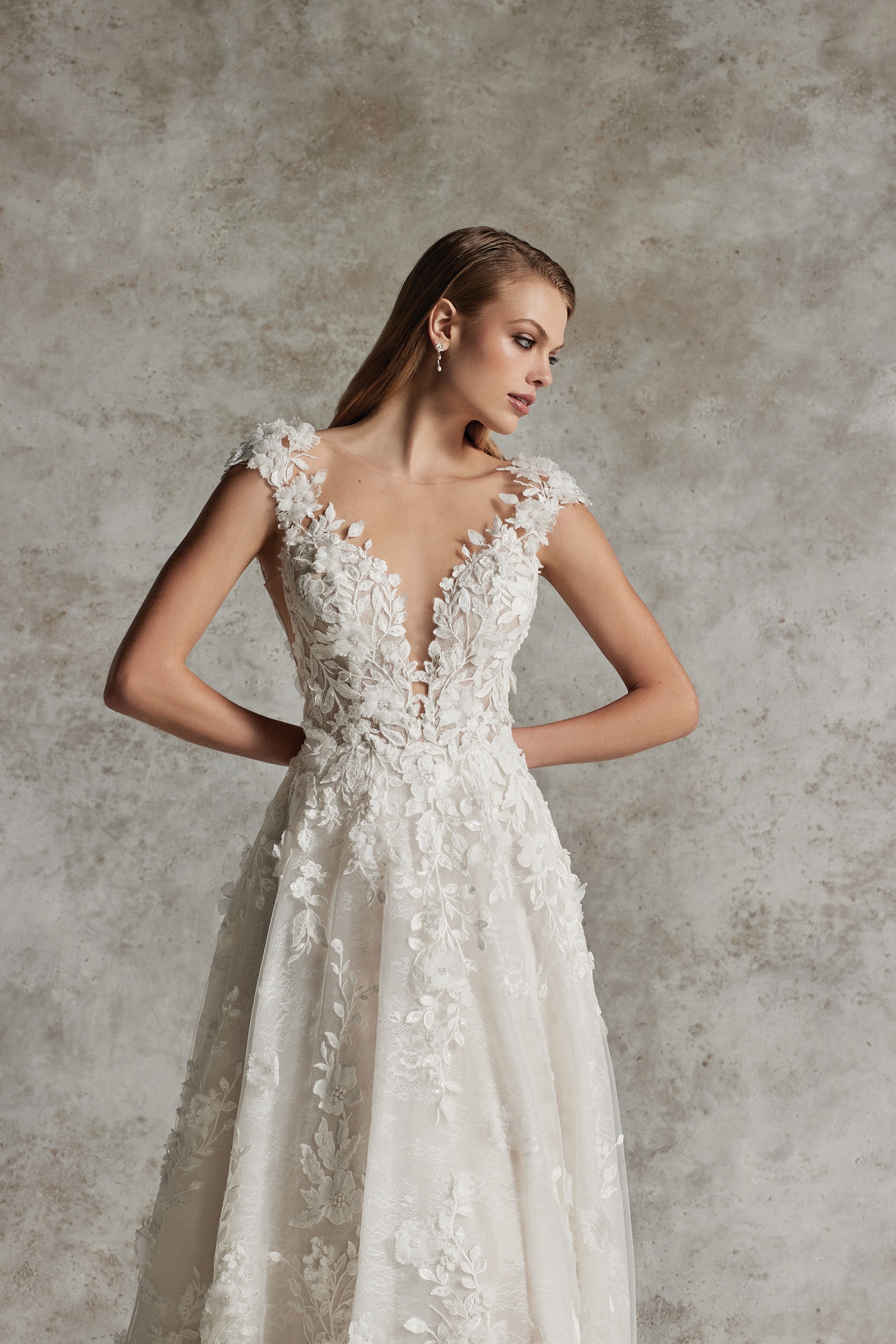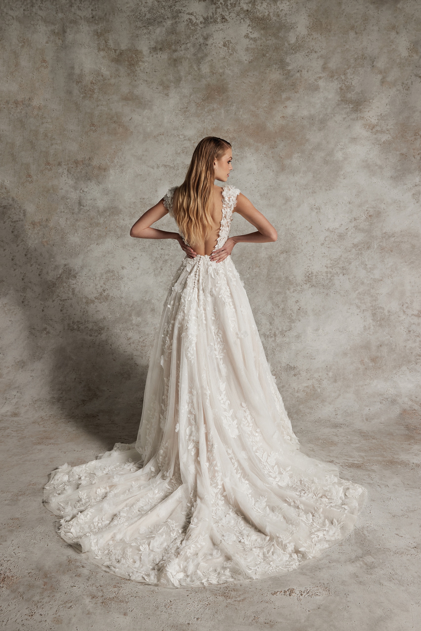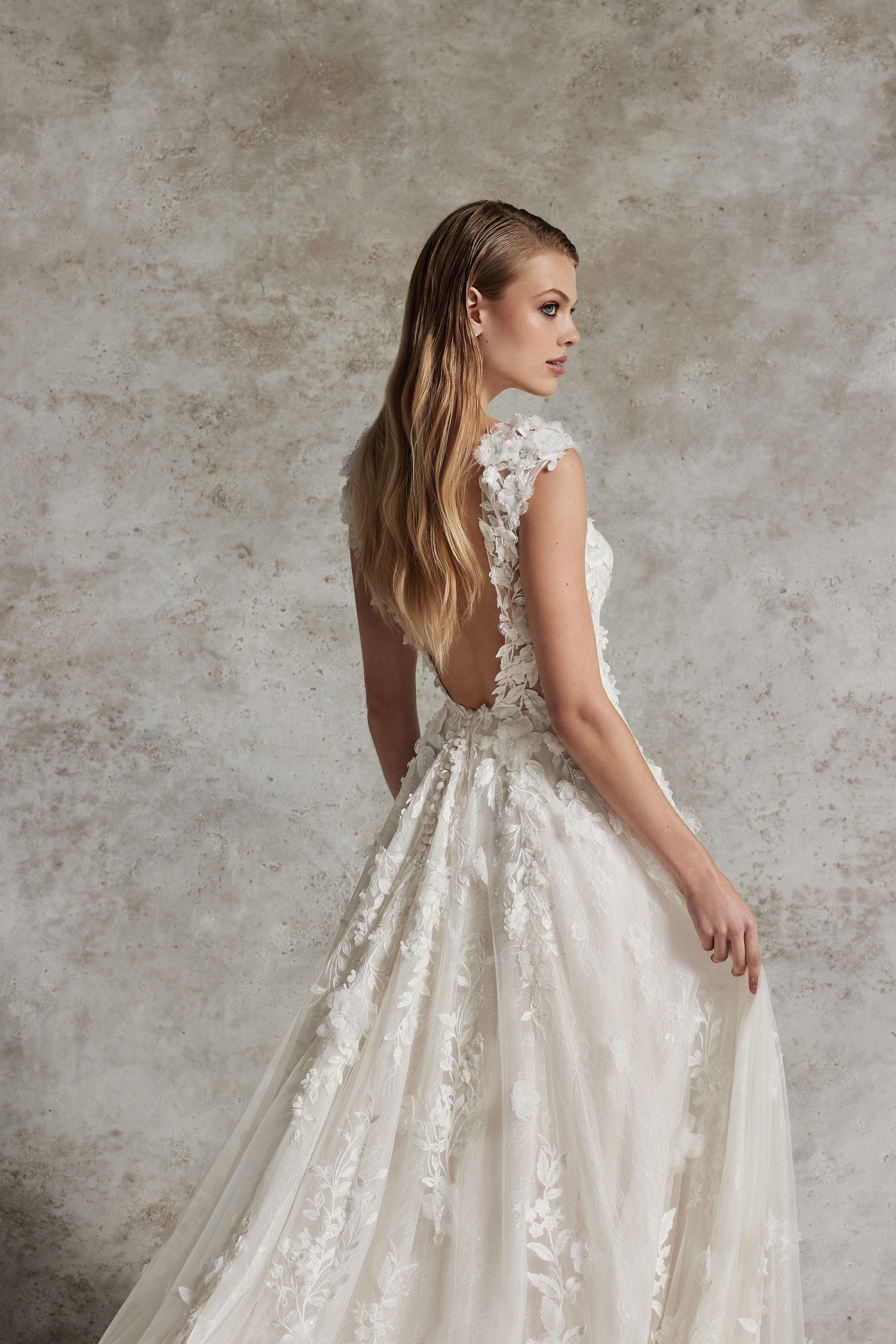 A-Linien-Brautkleid aus Spitze mit 3D-Applikationen und tiefem Rückenausschnitt