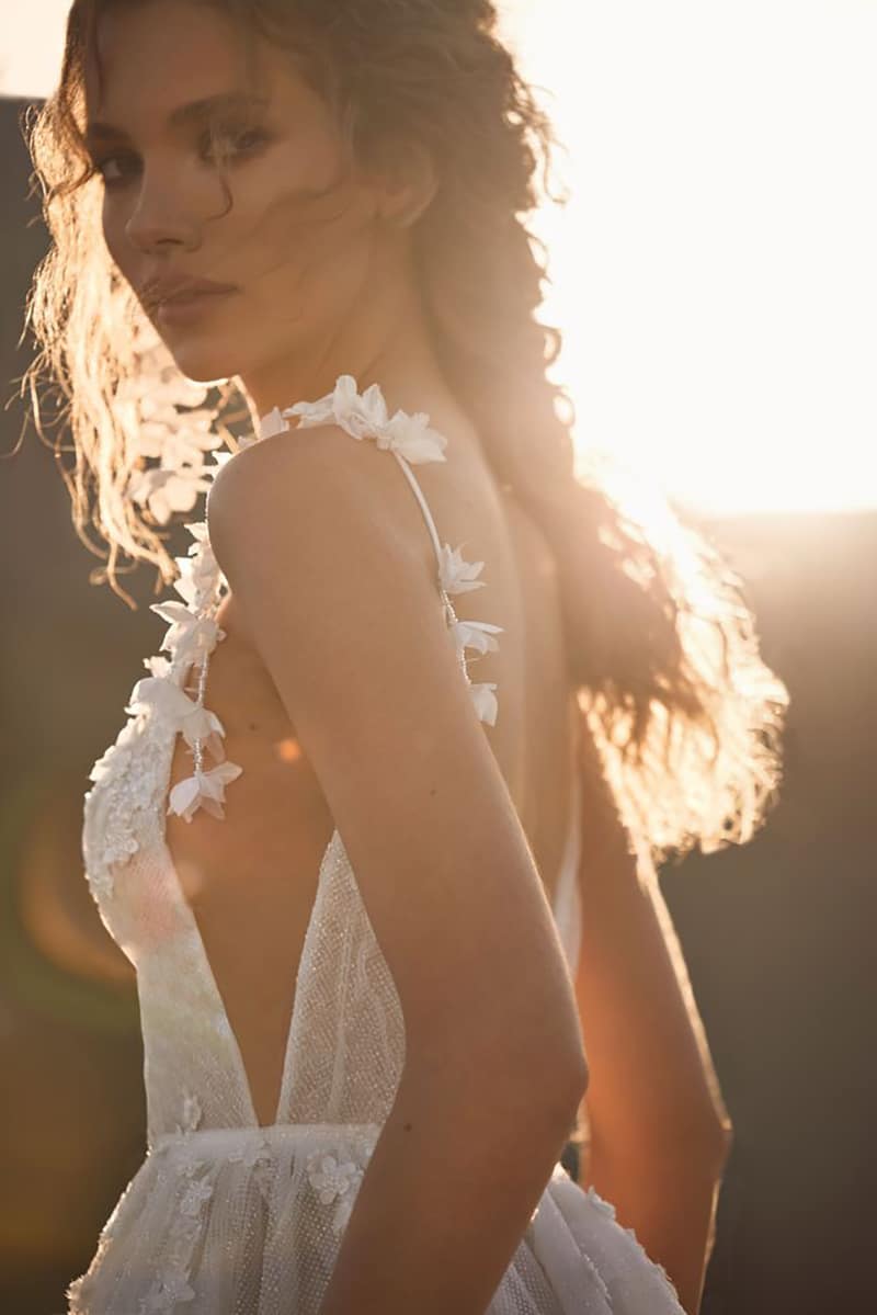 Verträumtes Hochzeitskleid mit Trägern, verziert mit voluminösen Blumen. Das Kleid ist üppig mit Glitzer und 3D-Blumen verziert. Mit tiefem V-Ausschnitt, V-Rücken und einer Midischleppe.