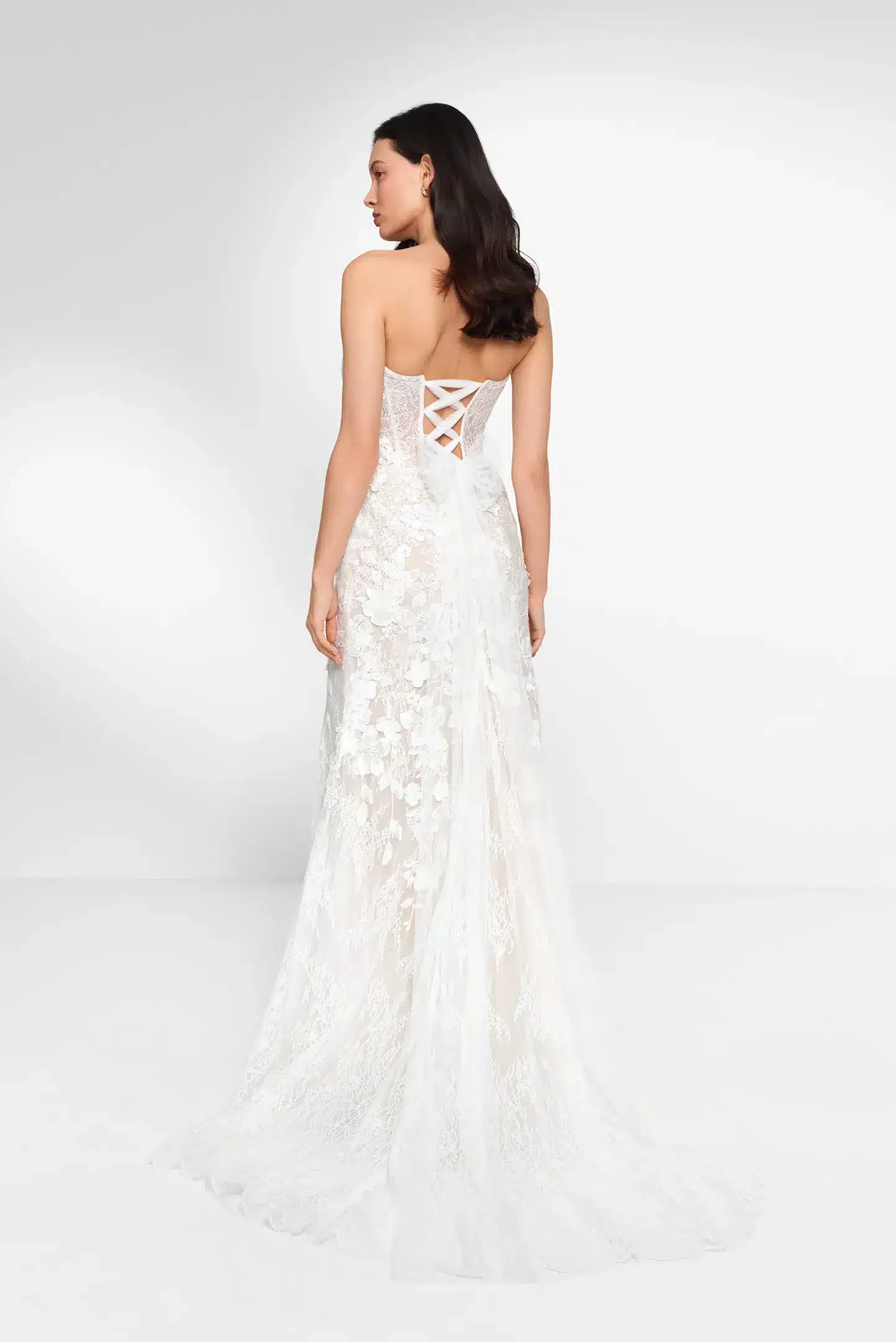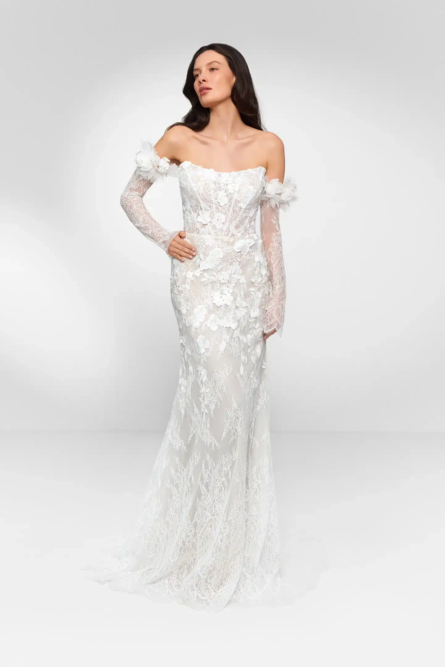 Eine klassische, feminine Silhouette mit Cat-Eye-Ausschnitt und einem schmeichelhaften Korsett-Oberteil, das über die gesamte Länge des Kleides mit botanischer Spitze verziert ist. Willow kann mit taillierten Spitzenärmeln mit dreidimensionalen, handgefertigten Blumenapplikationen kombiniert werden. Es ist für die anspruchsvolle Braut gedacht, die Raffinesse und Anmut verkörpert.