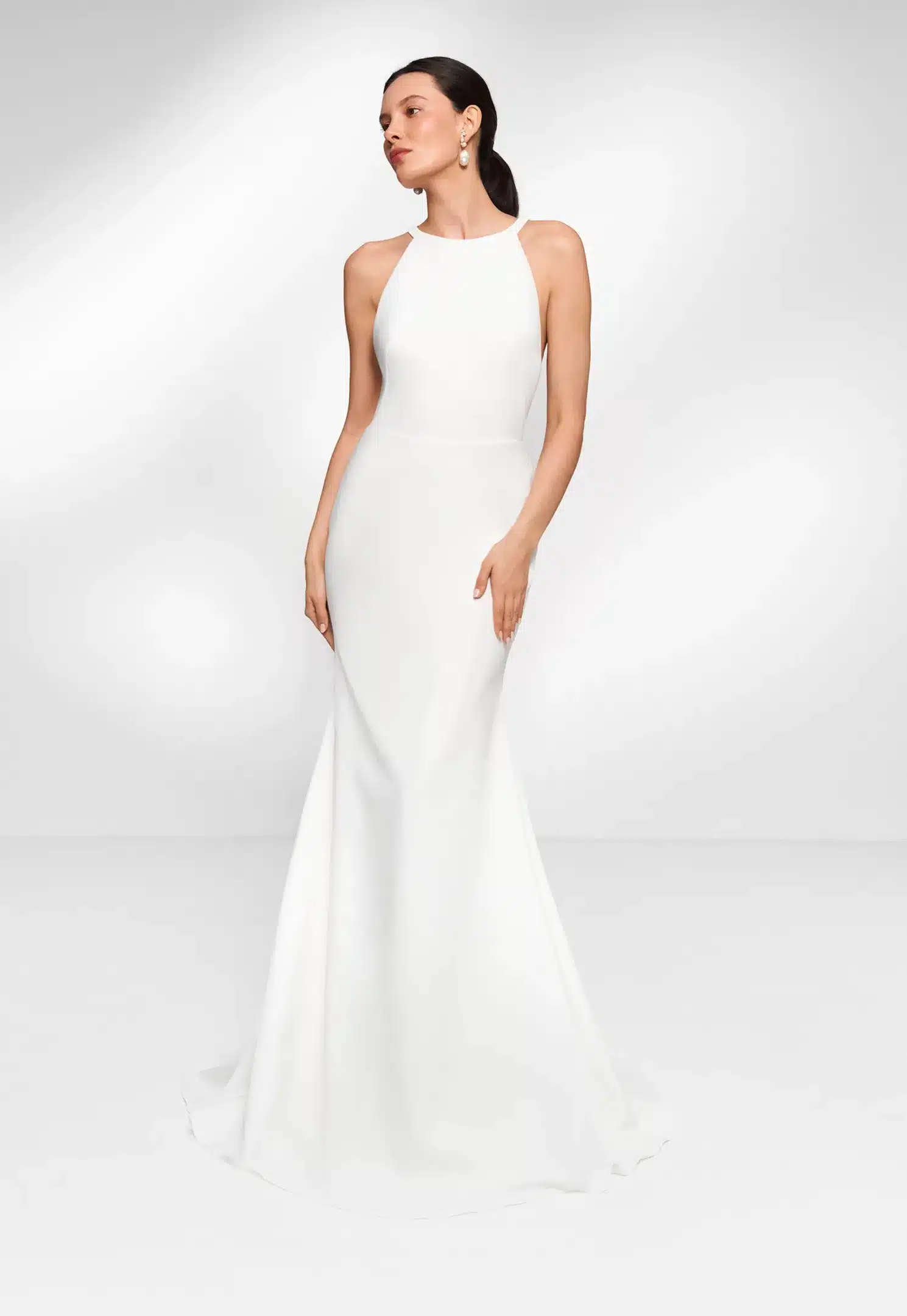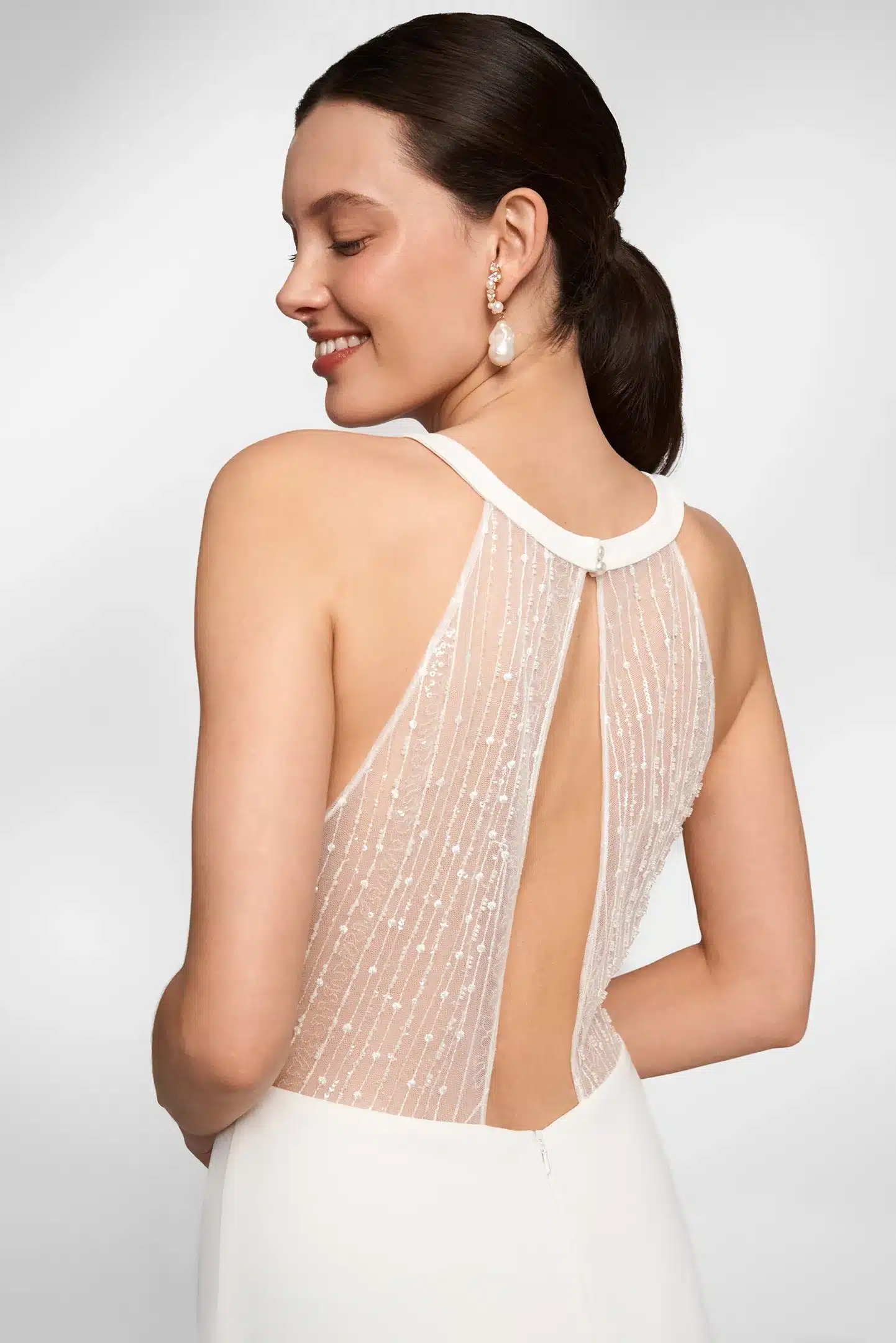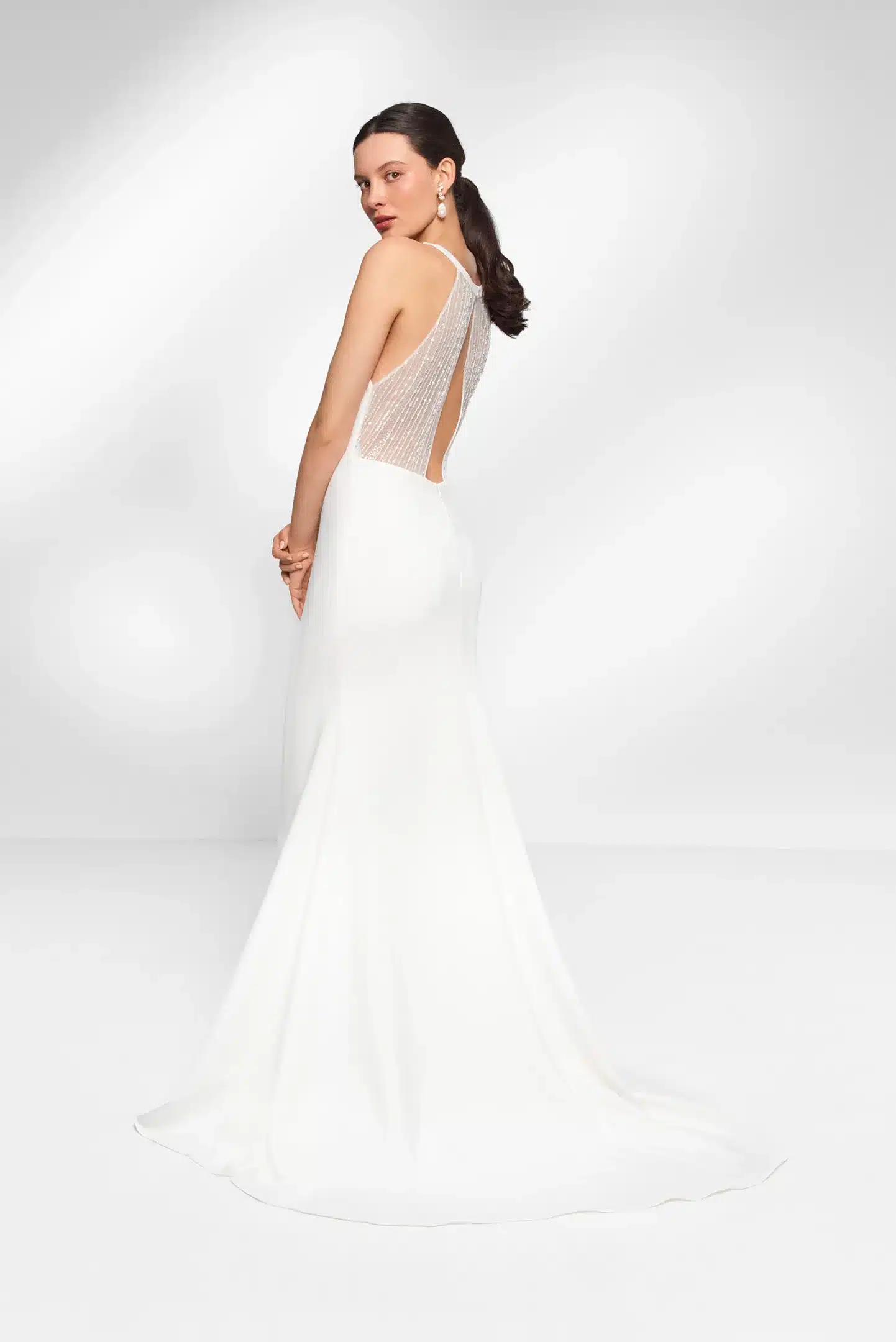 Die glamouröse, figurbetonte Meerjungfrauen-Silhouette mit Neckholder-Ausschnitt und auffälligem Rückenausschnitt mit Perlenstickerei ist eine harmonische Mischung aus Schlichtheit und detaillierter Verzierung, die der Braut an ihrem besonderen Tag einen unvergesslichen Look beschert.