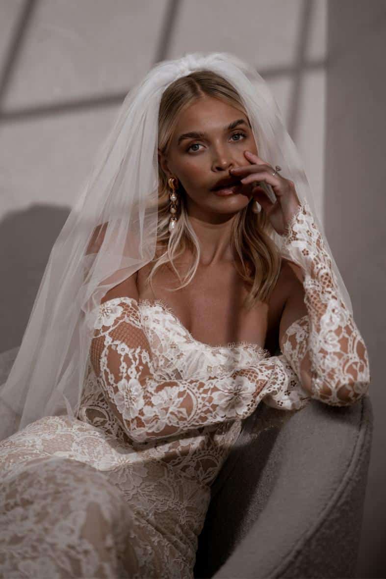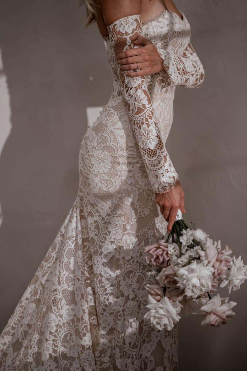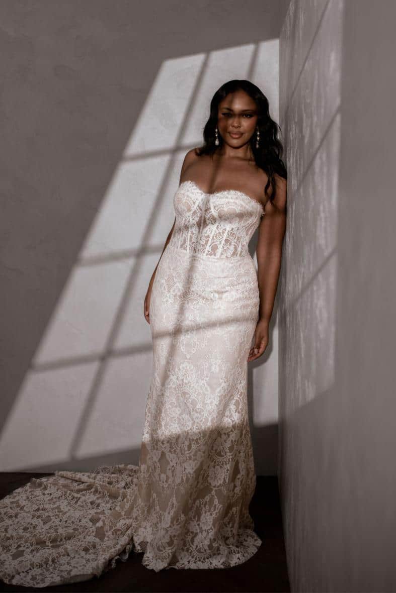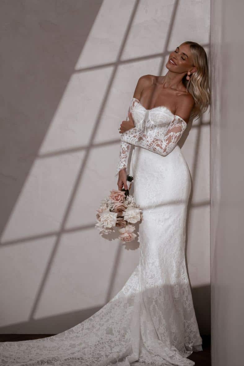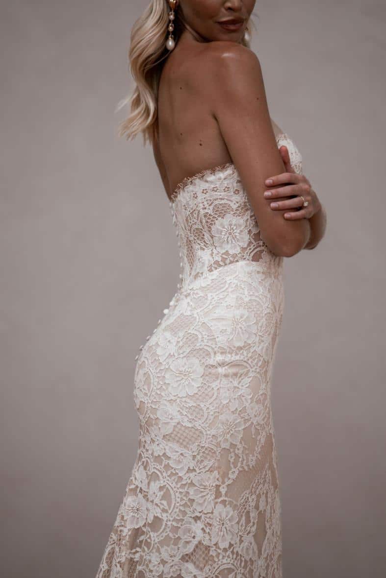 Die aufwendig gearbeitete Chantilly-Spitze mit atemberaubenden Wimpernkränzen, gepaart mit den abnehmbaren Ärmeln und den konturierenden Miederstäbchen macht Winnie zu einem atemberaubenden Kleid.