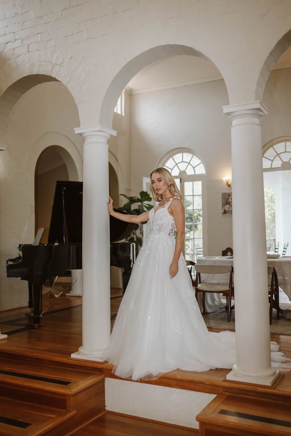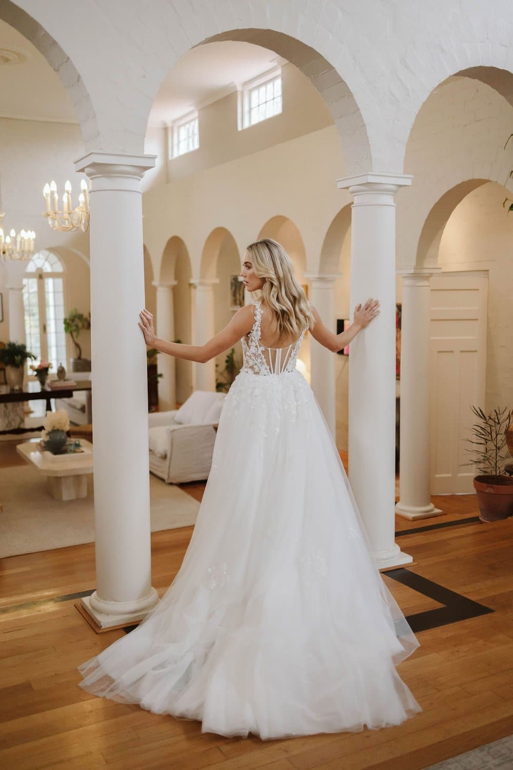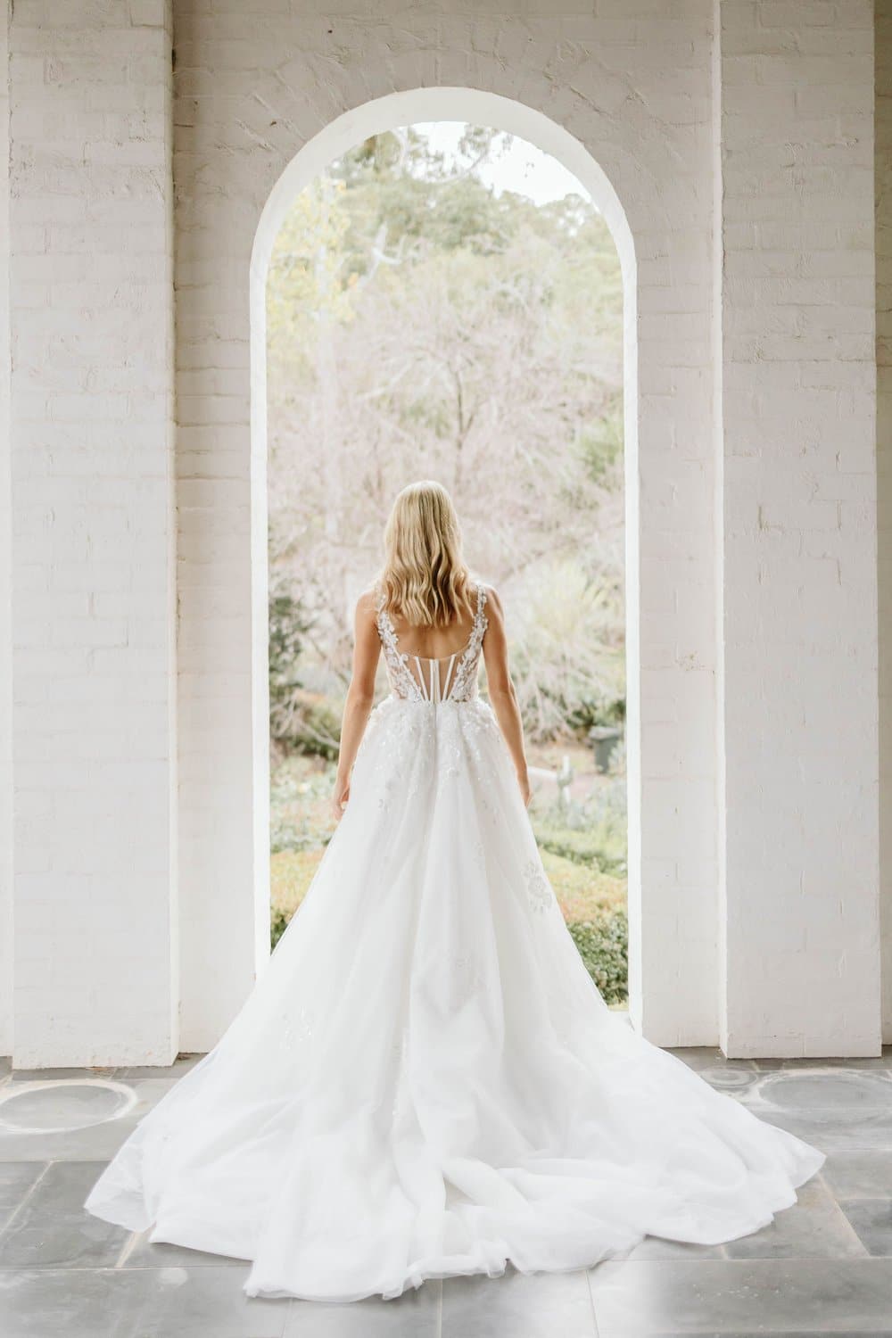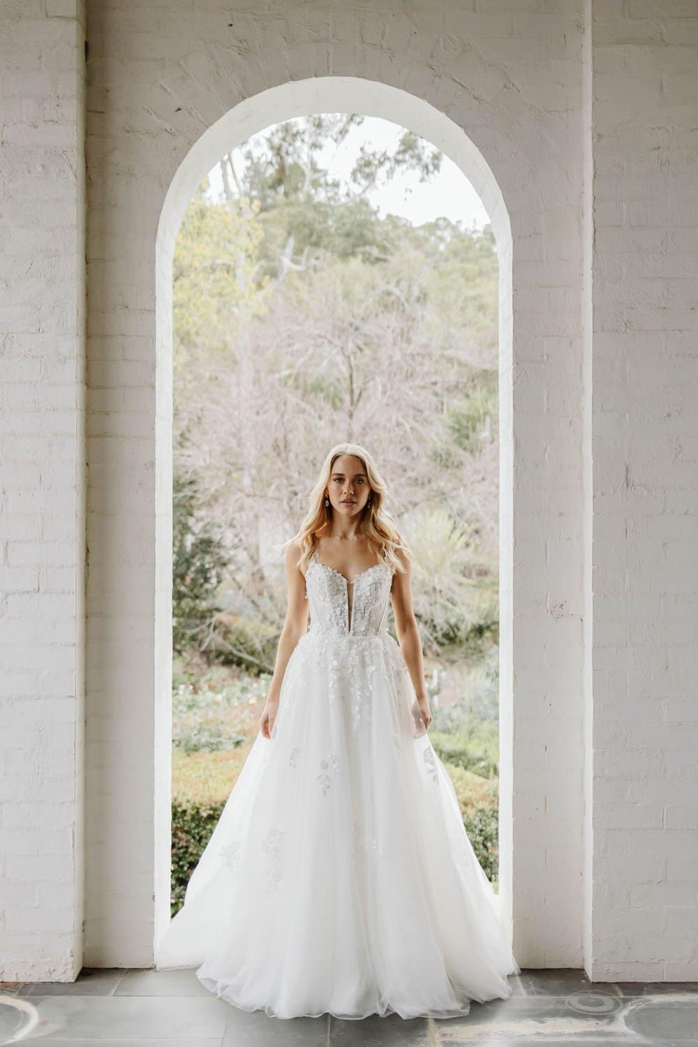 Ein wunderschönes Kleid in A-Linie mit einem Mieder aus Spitze und einem schmeichelhaften herzförmigen Ausschnitt.