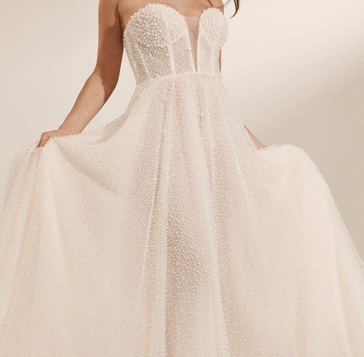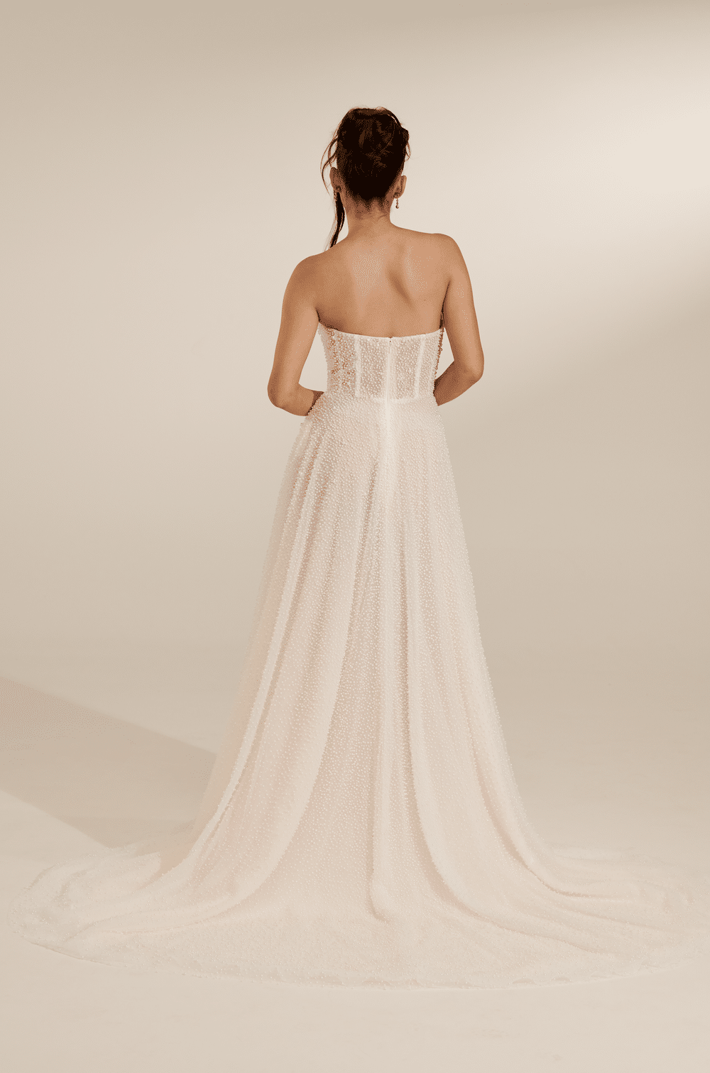 Ein wunderschönes trägerloses Hochzeitskleid mit strukturiertem tiefem Mieder, atemberaubender Perlenspitze und einem A-Linien-Rock.